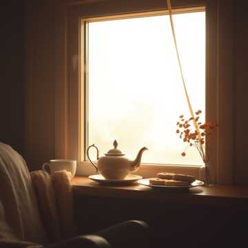 Warm analog-style keys (Rhodes/Wurlitzer vibe), light lo-fi hip-hop inspired drums (crisp but soft), gentle reverb and delay on vocals, airy background textures, no heavy bass drops or aggressive elements, overall soft and enveloping sound like steam rising from a tea