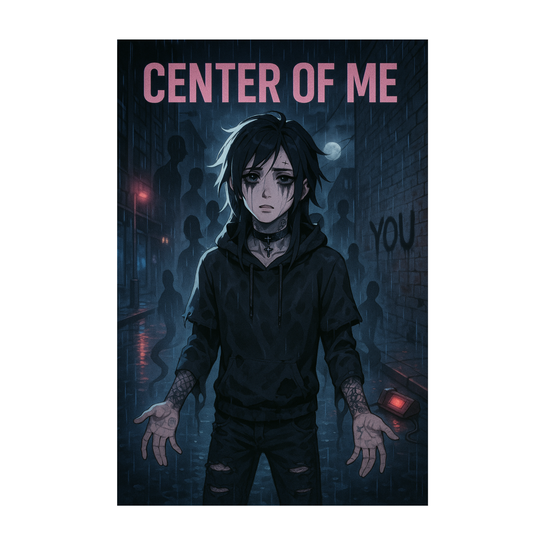 This emo rap–alternative rock fusion opens with mournful guitar arpeggios, trap hi-hats, and deep 808s at 75–85 BPM, Verses use lush pads and reverb-heavy vocals, Choruses feature gritty guitars and punchy drums, The bridge shifts to ambient noise and feedback, peaking in a dense, emotive outro