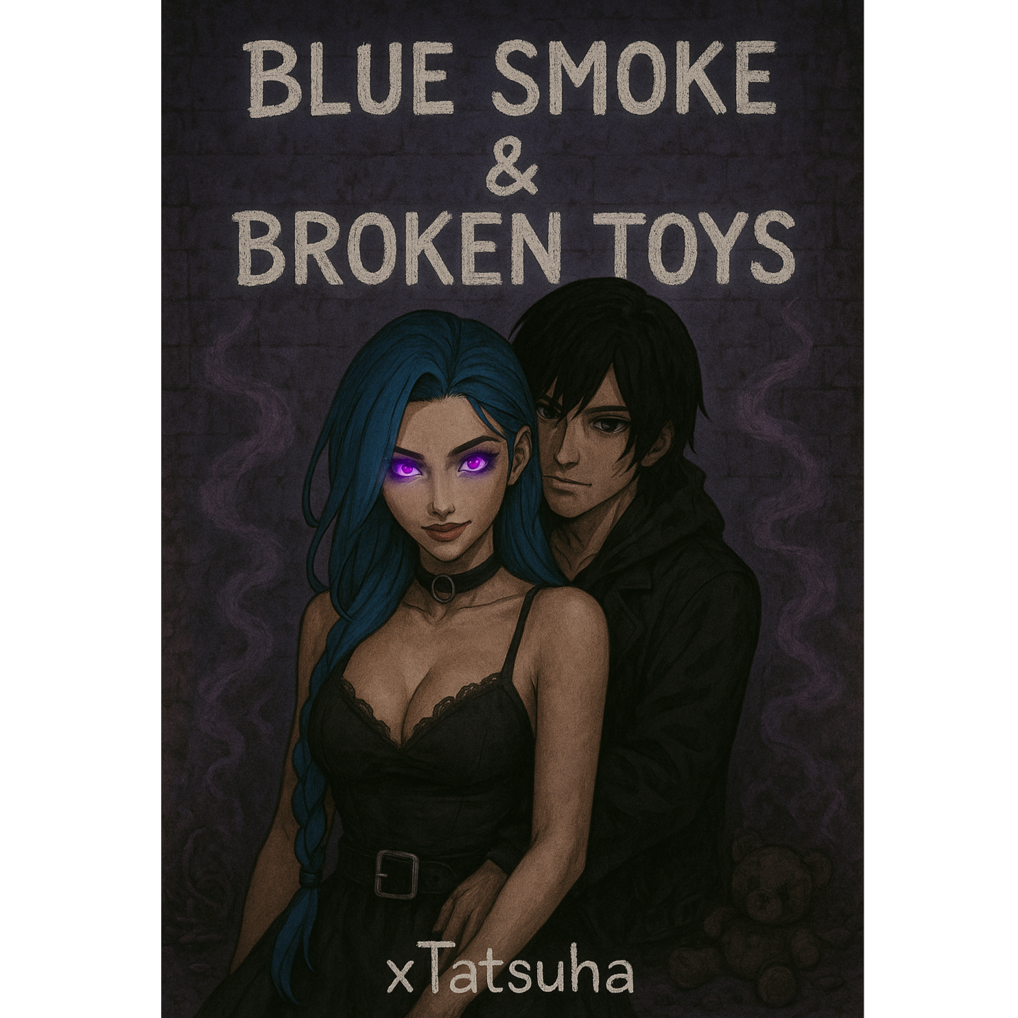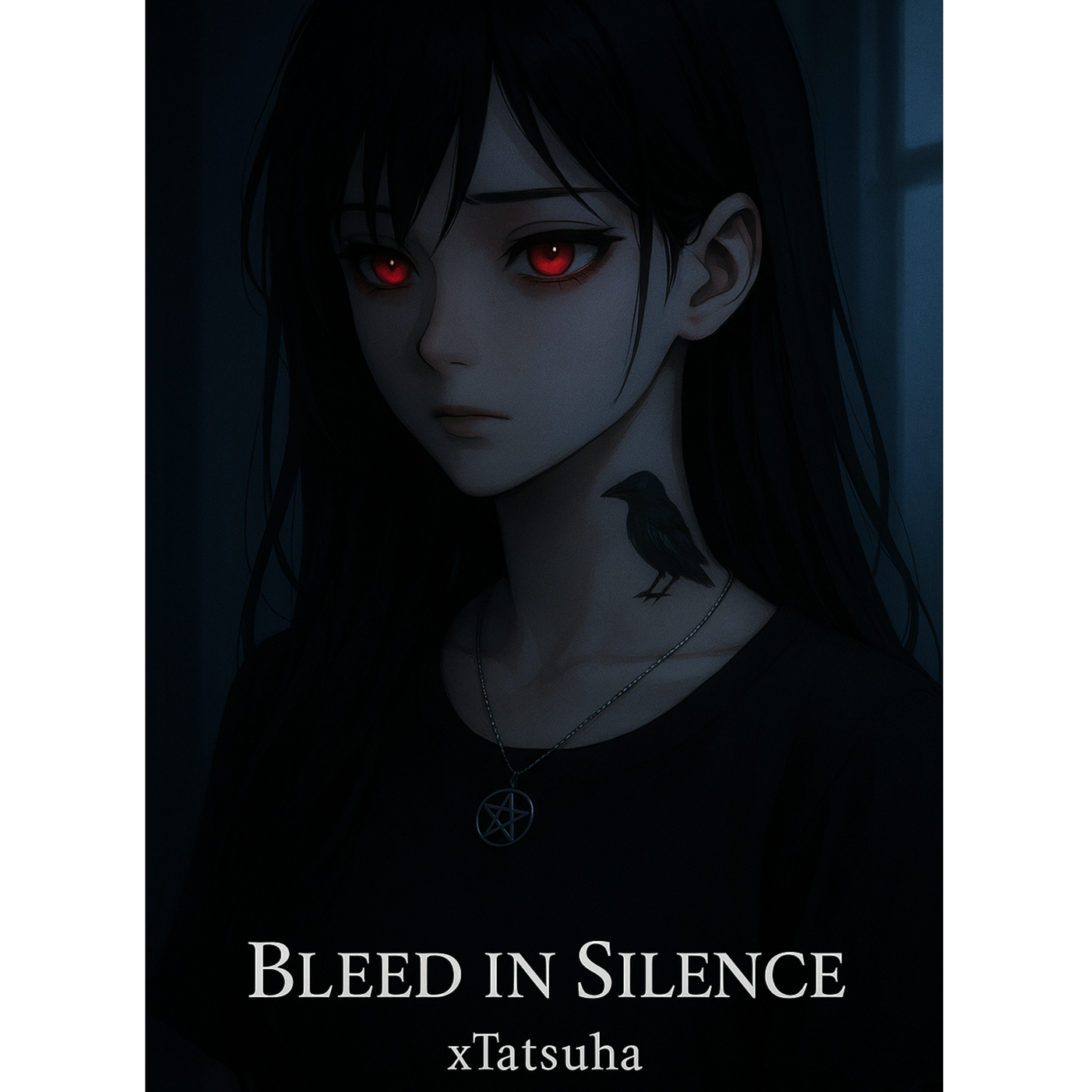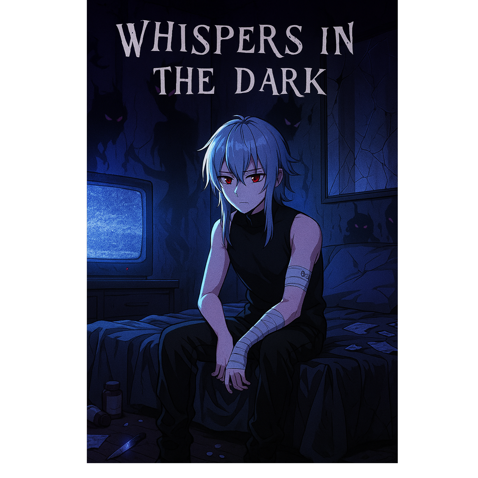 A Trap/Emo/Lo-Fi track featuring a dark, moody beat with deep sub-bass, distant snaps, and sparse hi-hats, The verses float on reverb-heavy synth pads, while TV static and whispered vocal samples create an eerie, immersive texture, Subtle detuned keys add melancholy to the mix