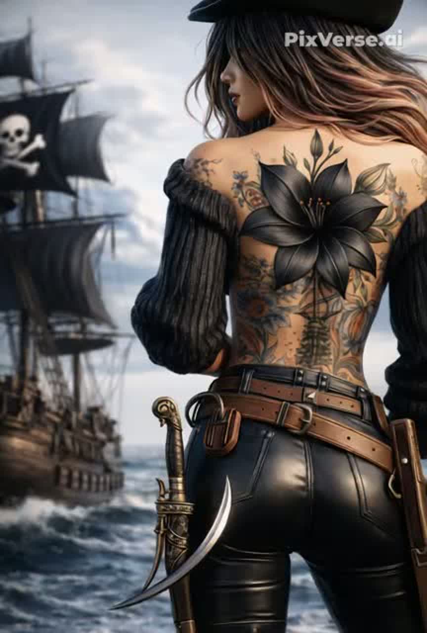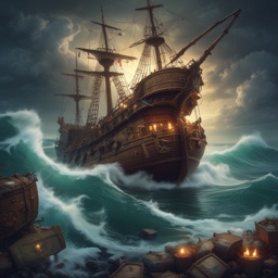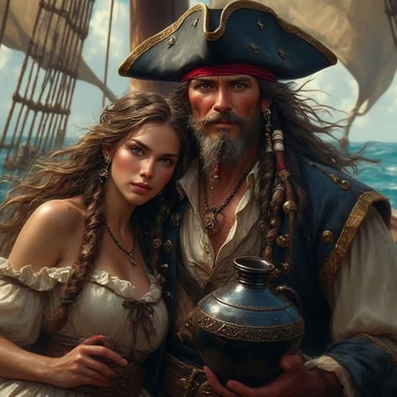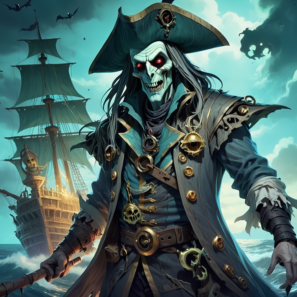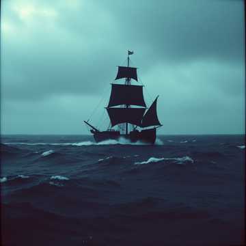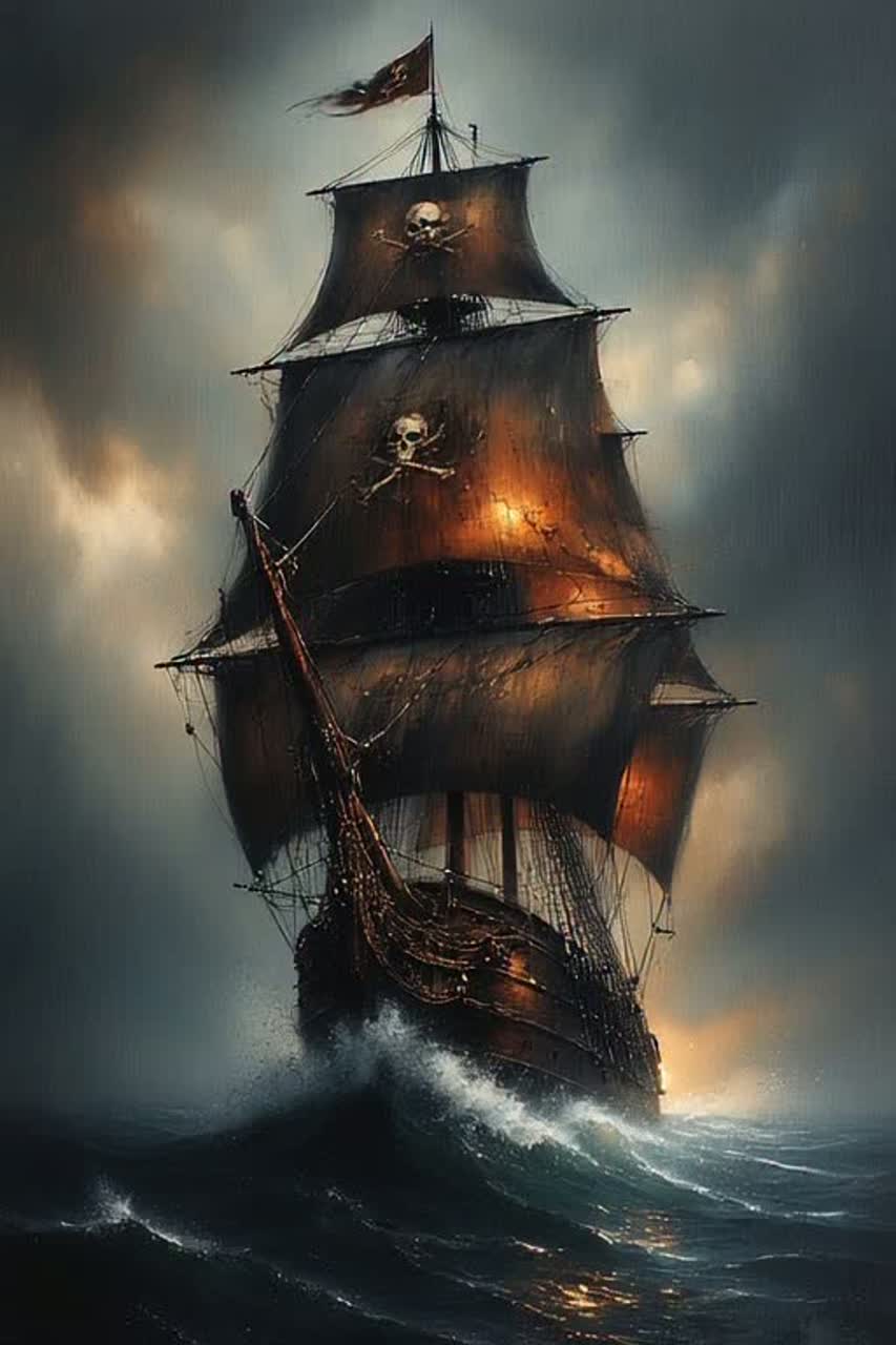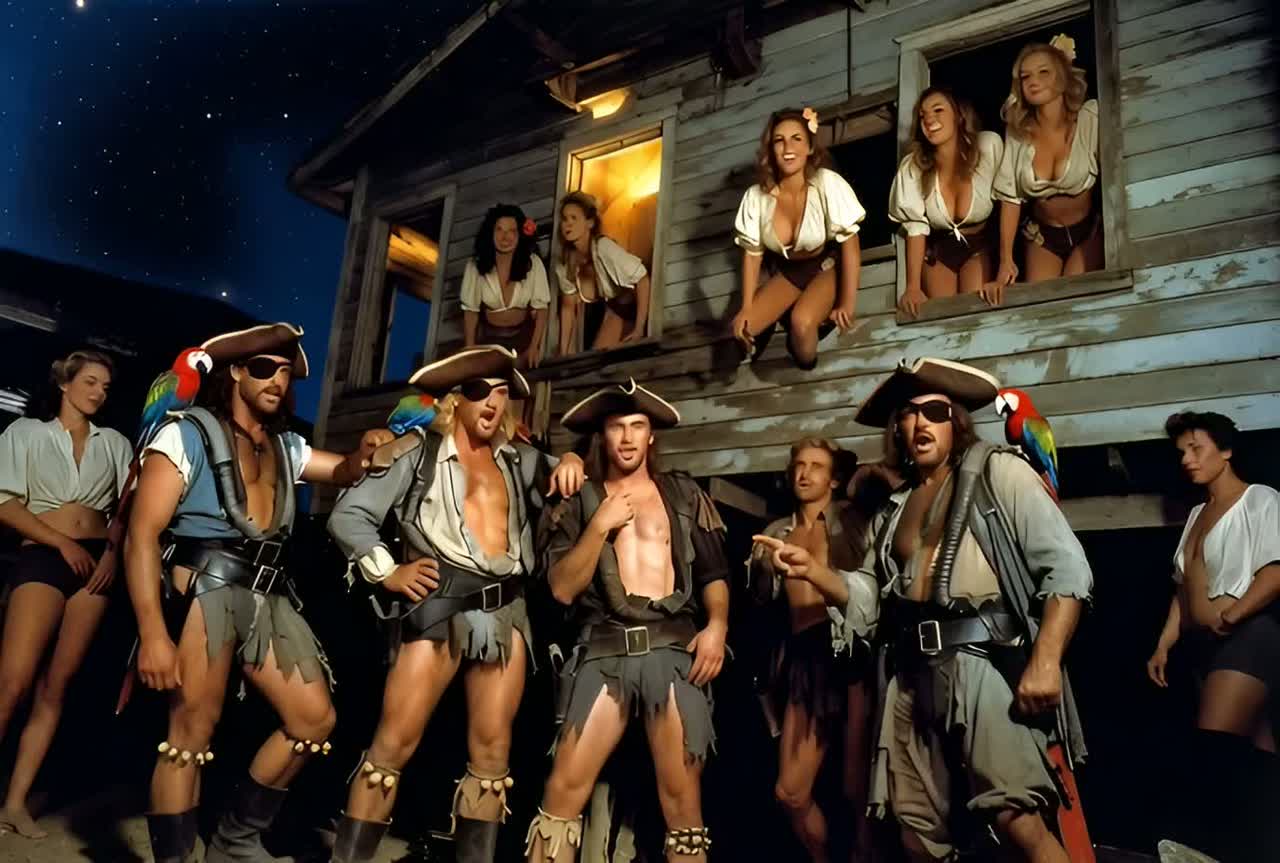 Cinematic pirate shanty meets modern pop; piano + strings + electronic heartbeat; creaky ship ambience; shanty group chants (aye, heave-ho); impassioned powerful Male lead vocal; sexy + dangerous tone; call-and-response crew vocals; sea percussion (anchor chains, wooden deck stomps); chorus big and thundery; Key: minor; lush harmonies; dramatic wind + wave textures; emotional + epic