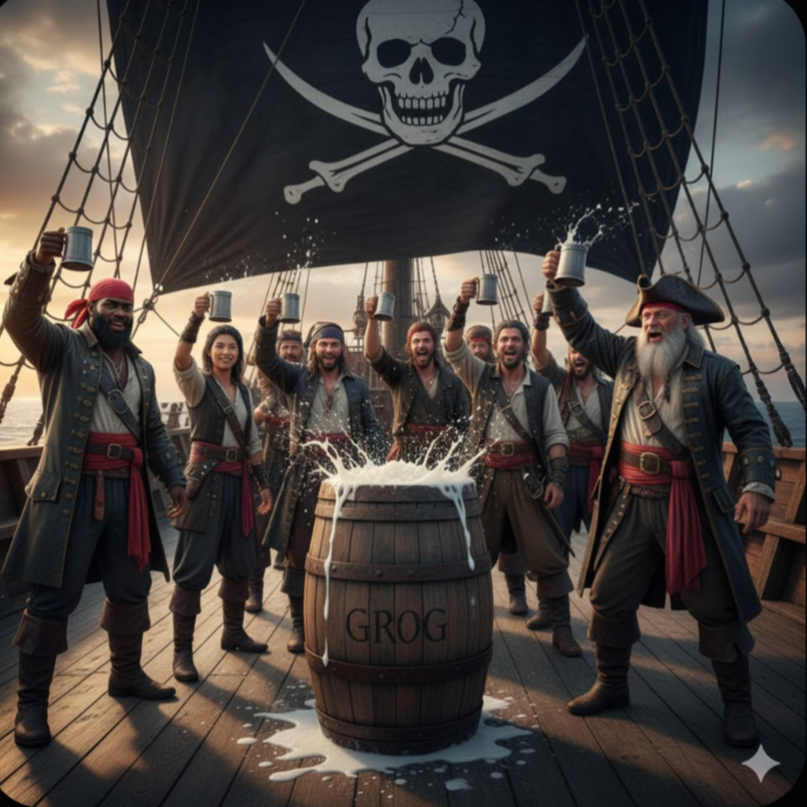 bpm180, Lively, Rowdy, jig-driven, sea shanty, East Coast kitchen ceilidh, fiddles, accordions, bouzouki, tin whistle, bodhrán and stomping boots lock in with gang-vocal “yo-ho” chants, handclaps and tankard slams on wooden tables, Raucous but Warm, sing-along, pub chorus vibes, Maritimes kitchen party swagger, waves crashing, creaking masts and distant gulls, Lead vocals are gritty, playful and commanding, big call-and-response choirs, Sounds like a ship’s crew and a packed kitchen ceilidh all shouting in unison