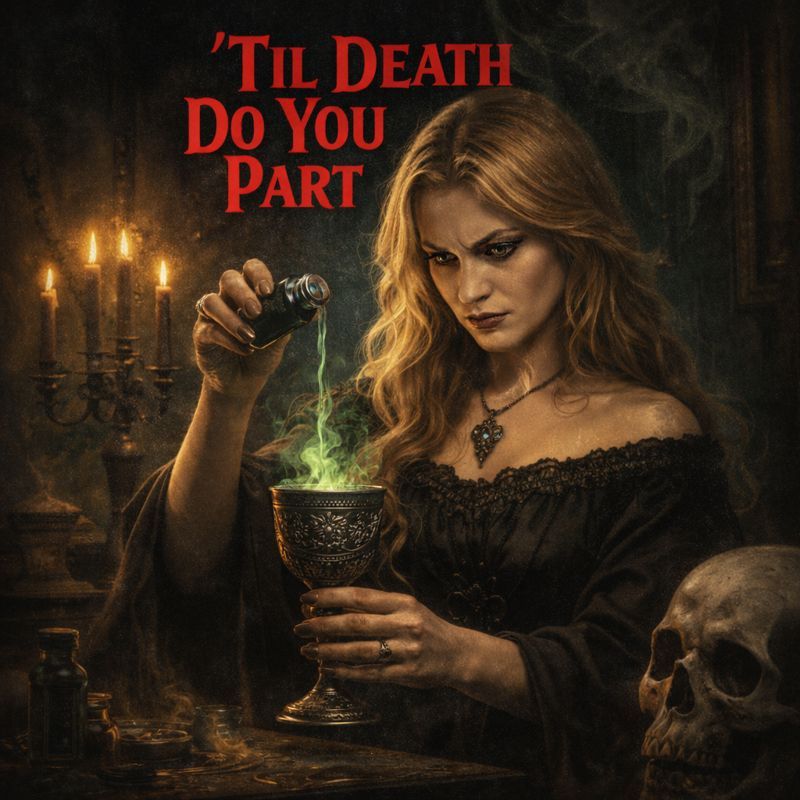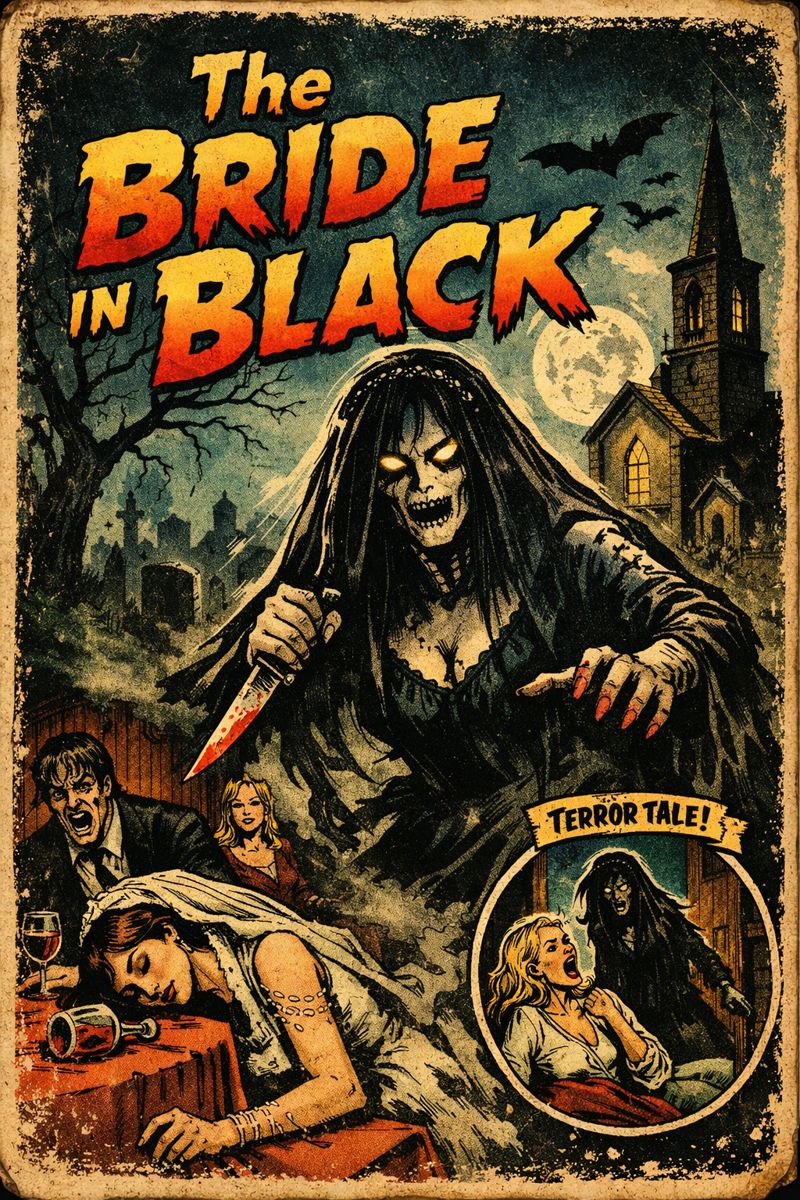 Fast, aggressive, brutal heavy metal song with classic NWOBHM energy and a strong thrash metal edge, Opening with a syncopated, palm-muted riff that locks tightly with the drums, followed by harmonized dual lead guitars, Driving gallop rhythm, sharp riff changes, and energetic tempo throughout, Clean, powerful male vocals with a high range and dramatic delivery, Anthemic chorus with strong melody and minor-key darkness, Tight, punchy production, old-school metal feel with modern clarity, Dark horror theme about a poisoned bride returning as a vengeful ghost, Frequent lead guitar flourishes, brief melodic solo, and a relentless, fast-paced structure