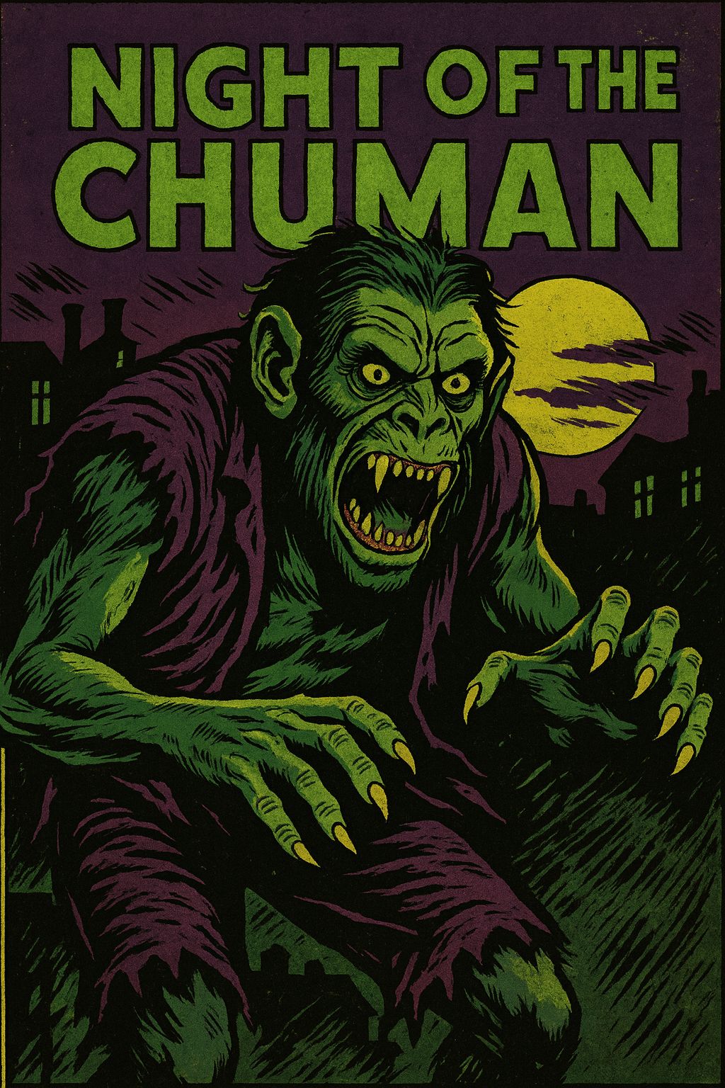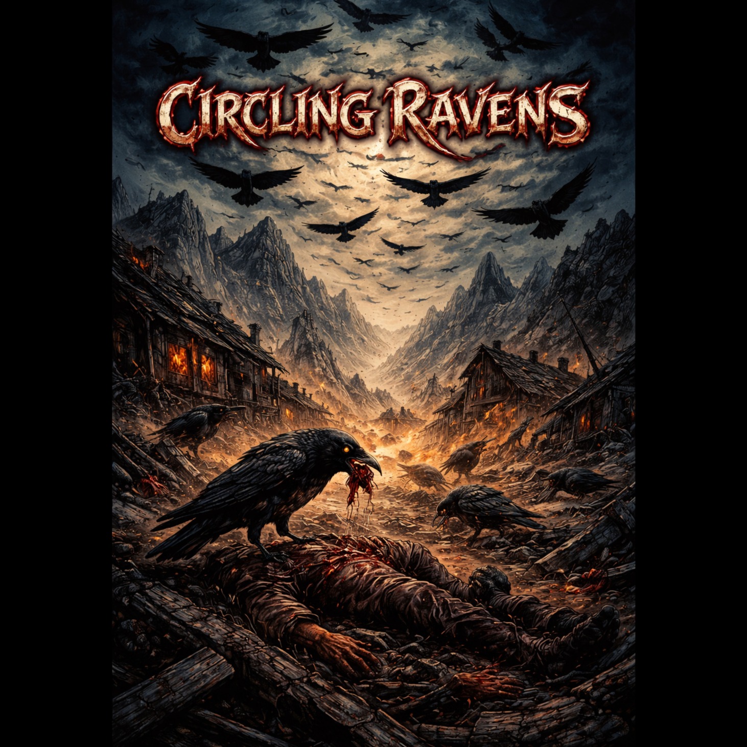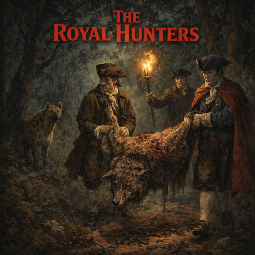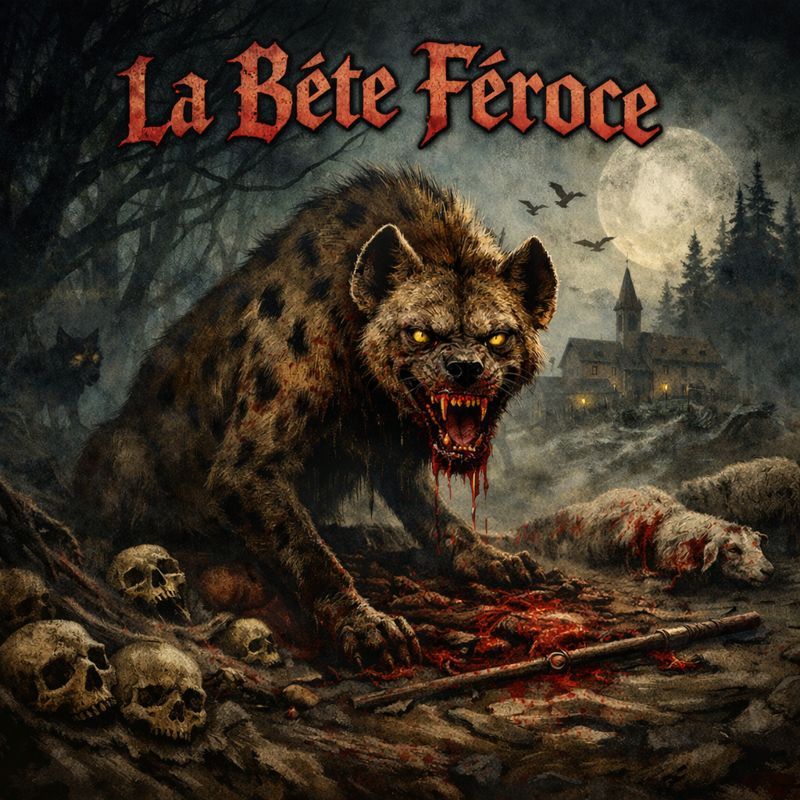 Heavy horror metal with a brutal, dark tone, Begin with deep African-style tribal drumming and chanting ambience to set the remote jungle atmosphere, then slam into fast, crushing guitars and relentless double-kick drums, Verses should feel tense and stalking, building into a massive, aggressive chorus, Keep guitars dominant with occasional ominous brass hits, Vocals intense and clean, Epic, violent, and cinematic — the creature’s final rampage, Relentlessly fast, male vocals