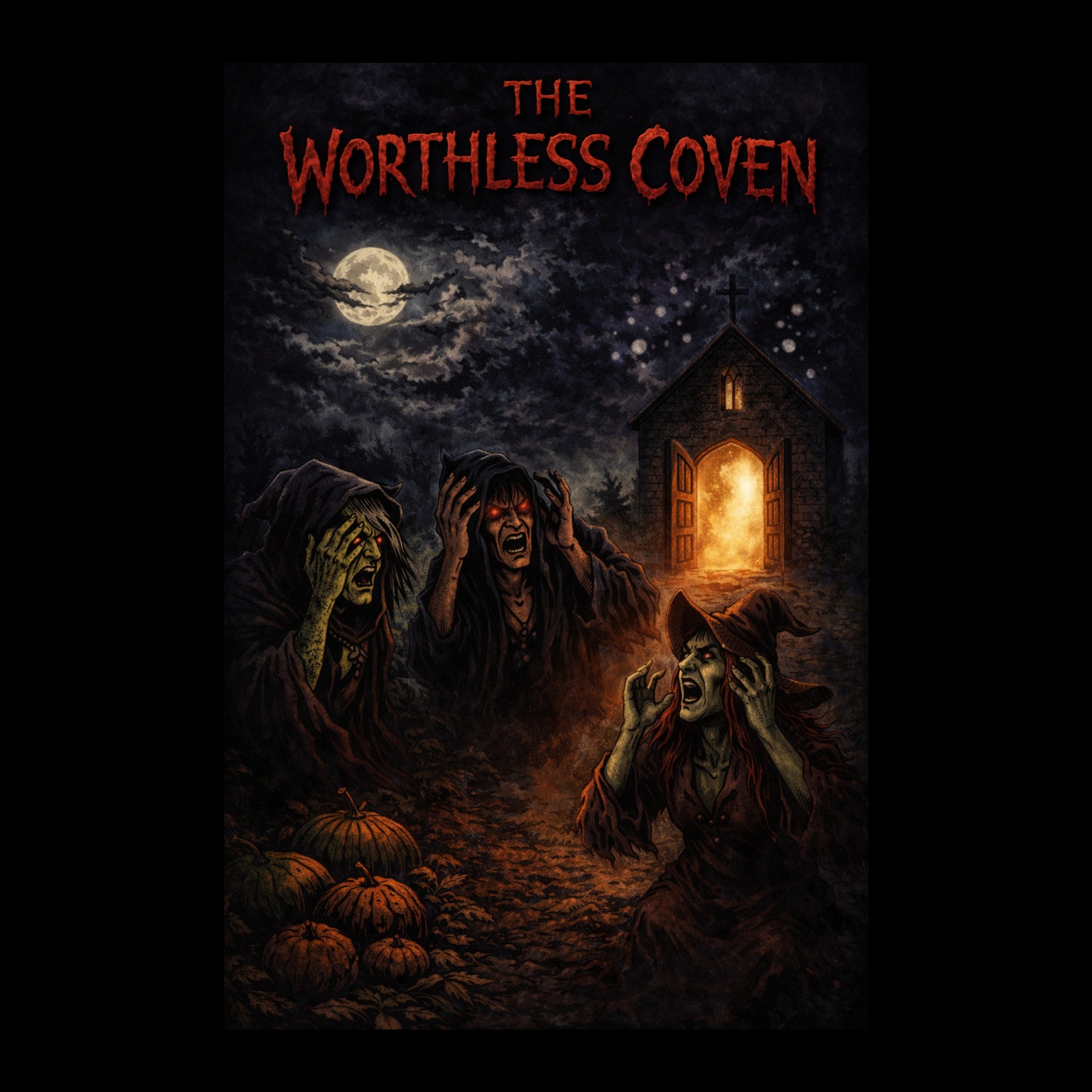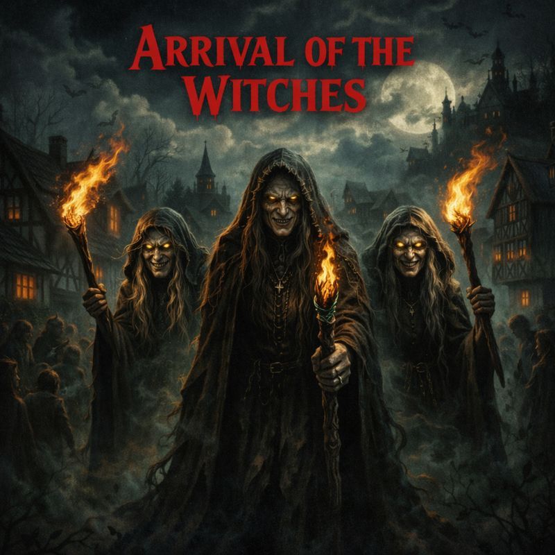 Old-school fast thrash metal with classic heavy metal elements, High energy, aggressive, fast tempo around 185-200 BPM, Driving palm-muted guitars, rapid double-kick drums, and chugging rhythm riffs, Include melodic dual lead guitar harmonies during instrumental sections and chorus fill lines, Vocals should be tense, dramatic, and clear — not growled, but powerful and gritty in classic thrash style, (Verse sections): Fast and driving, galloping rhythm riffs, urgent tone, (Prechorus): Slight lift in melody, suspense building, tense atmosphere, (Chorus): Anthemic, powerful, darkly melodic, but still heavy and thrash-driven, (Verse two): Same as verse one, but slightly more intense, (Bridge): Slow down into a sinister breakdown — eerie, doom-tinged atmosphere, Whispered or chant-like vocals, (Guitar Solo): Explosive, dual harmonized leads, fast and melodic, classic metal style, Mood: Dark, supernatural, cinematic, rising dread and power