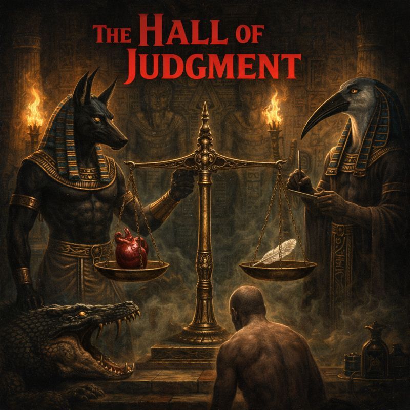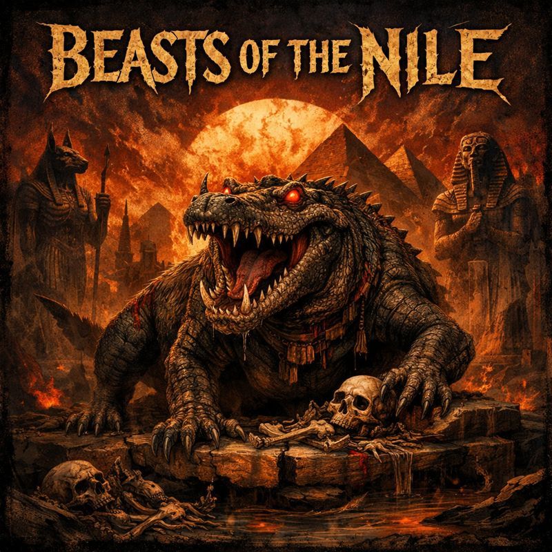 Mid-fast tempo, aggressive thrash metal with strong NWOBHM and classic thrash influence and a middle eastern overtone, Driving galloping riffs, tight palm-muted rhythms, and energetic double-kick drums, Minor-key melodies with an ominous, ancient feel, Incorporate subtle North African and ancient Egyptian elements through modal guitar leads, percussion accents, and brief atmospheric flourishes, without overpowering the metal core, Clean, powerful male vocals with a commanding, narrative delivery, Verses are tense and riff-driven, building steadily, Prechorus increases intensity and momentum, Chorus is anthemic, memorable, and authoritative, Guitar solo is melodic yet aggressive, evoking ritual judgment and ancient dread, Overall mood is mythic, foreboding, and relentless, blending historical mysticism with classic heavy metal aggression, Keep instrumental sections compact and short