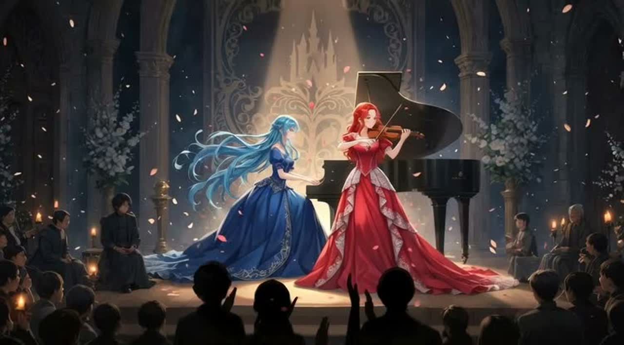 A cinematic J-Pop power ballad featuring a blend of traditional Japanese instrumentation and modern orchestral pop elements, The track opens with a melancholic solo violin melody accompanied by delicate piano arpeggios and atmospheric synth pads, As the song progresses, it builds into a grand arrangement with soaring orchestral strings, driving cinematic percussion, and a prominent electric bassline, The vocal is a powerful, emotive female soprano with a clear, resonant tone, utilizing vibrato and dynamic shifts from intimate whispers to belted high notes, The harmonic structure follows a dramatic minor-key progression typical of anime themes, moving from a somber verse into an uplifting, anthemic chorus, Production is polished with lush reverb on the vocals and a wide, immersive stereo field for the orchestral layers, The tempo is a steady mid-tempo ballad pace, approximately 75 BPM, in the key of C# minor