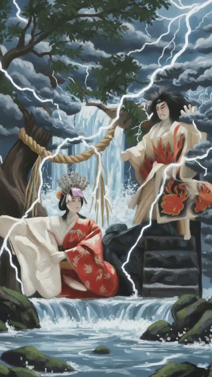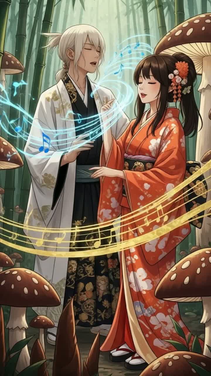 Arrangement: Begin with a haunting shakuhachi melody accompanied by subtle taiko drum beats, transitioning into a powerful symphonic metal and rock section with electric guitar and violin solos, Alternate between dramatic vocal duets and instrumental breaks, blending jazz grooves with traditional Japanese melodies, Conclude with a thunderous taiko drum and orchestral crescendo, fading into a delicate shakuhachi outro