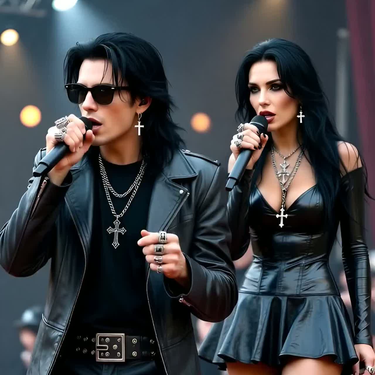 Gothic Metal, Gothic Rock, Duet, Sad Mood, Decadent Atmosphere, Deep Baritone Male Voice, Lust Clean Guitars Arpeggios, Melodic, Distorted Guitars, Deep Reverb, Flanger, Delay, Heavy Drums, [Mastering is Clean and Crisp], ‑intro wordless vocals excluded