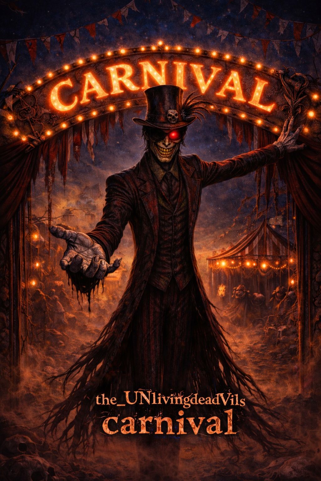 Style: Dark, spooky, high-energy mosh rap anthem inspired by Monster Mash vibes but modern, aggressive, and sinister, Theme: A chaotic horror party with zombies, vampires, and wolfmen raging in the pit, Instrumentation: Heavy distorted 808 sub-bass, gritty trap drums with metal double-kick accents, dark minor-key piano or organ stabs, eerie synth drones, subtle downtuned guitar chugs used sparingly for emphasis, Include graveyard ambience (chains, wind, distant screams, thunder), Rhythm: Head-nodding rap groove with mosh-ready drops, 130–145 BPM, Vocals: Male vocals, Verses are aggressive, confident rap with sinister delivery, Hook is chant-like, dark, and menacing, Optional demonic spoken intro and breakdown ad-libs, Mood: Sinister, violent, hype, spooky, and built for a packed mosh pit