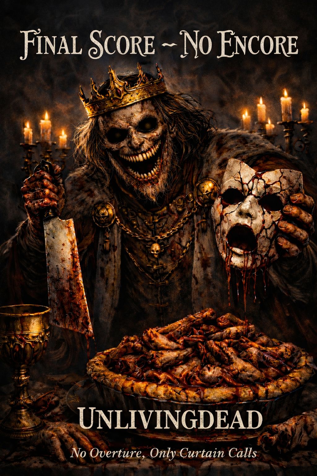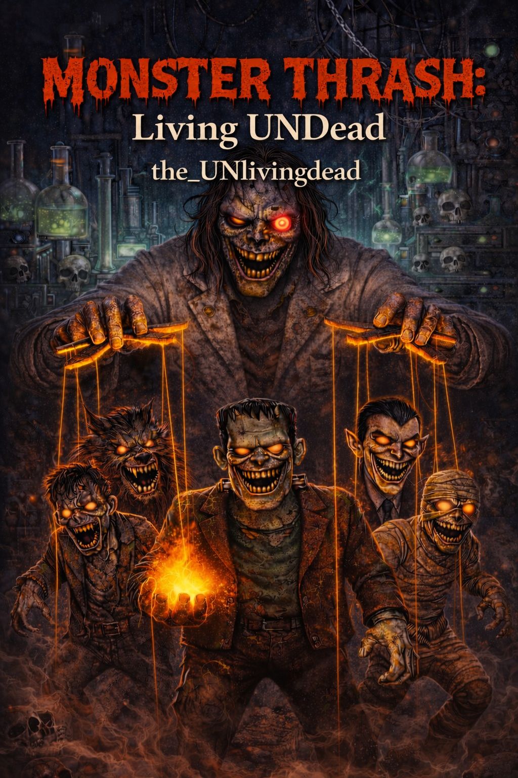 Genre: Aggressive Alternative Nu Metal / Metalcore, Style: Dark, SPOOKY HORROR-THEMED, and High-Energy Mosh Anthem (Sequel), Theme: A frantic, violent party of classic horror creatures (Zombies, Vampires, Wolfman), Instrumentation: Heavy, downtuned, chunky rhythm guitars (KVDE rap groove) with dissonant synth accents and **graveyard sound effects** for the horror feel, Use fast, technical drumming and booming sub-bass, The production must be loud, raw, and chaotic, mirroring the intensity of MONSTER THRASH Pt, 1, Vocal Style: Male vocals, Intro/Breakdowns feature a raw, guttural, demonic voice, Verses use aggressive shouting/singing (Dayseeker style) and high-speed, manic rap (KVDE style), Chorus is a massive, raw, and desperate screamed anthem, Mood: Urgent, violent, chaotic, and suited for a mosh pit with classic horror flair