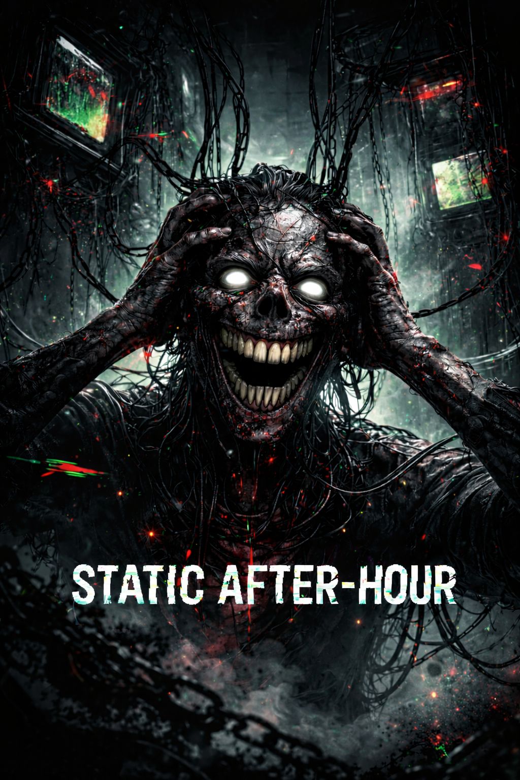 Style: Manic, psycho, high-panic energy with dark horror atmosphere