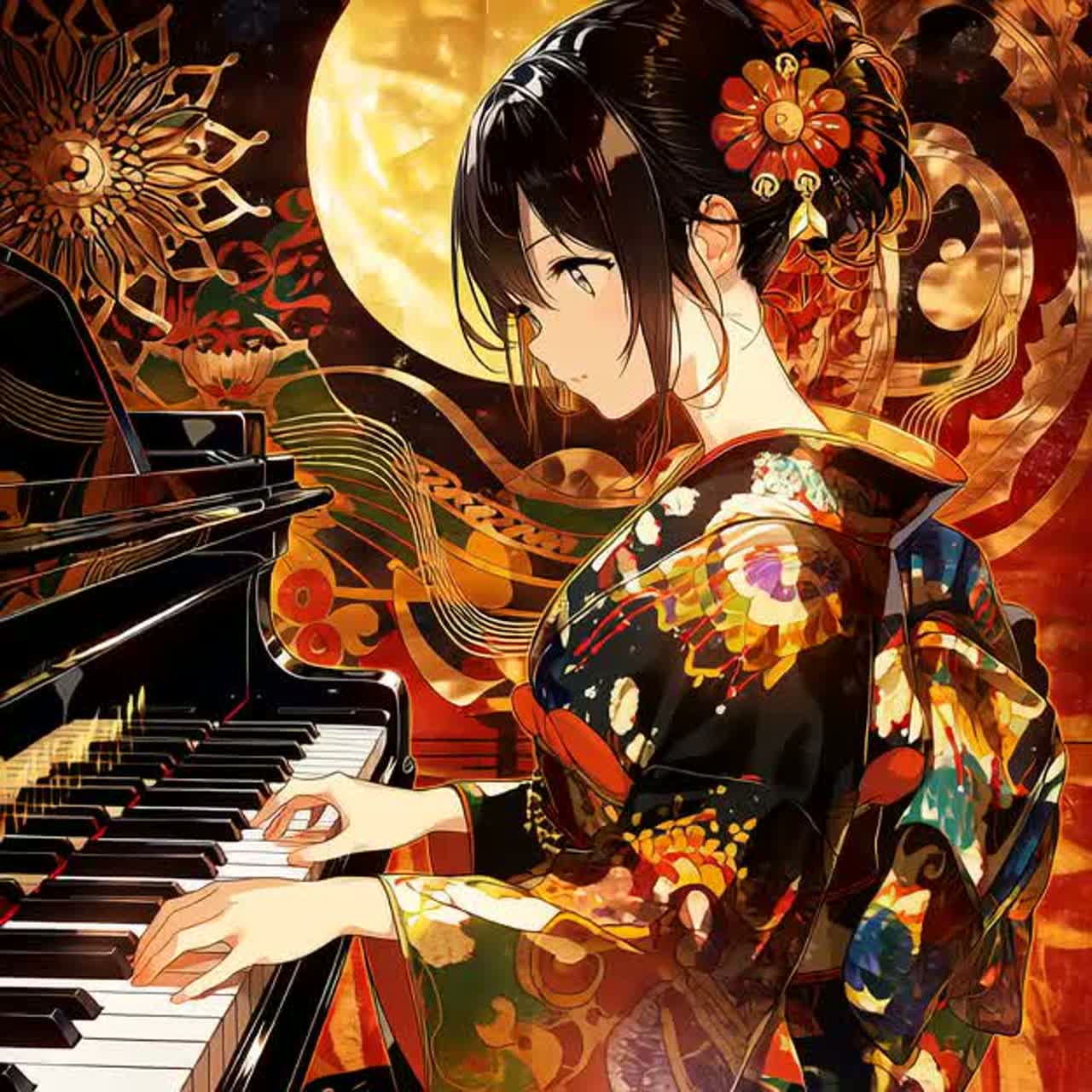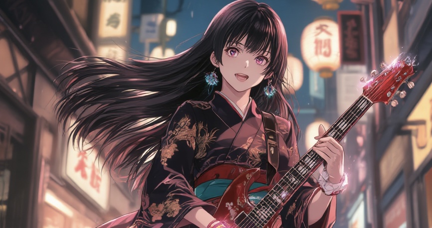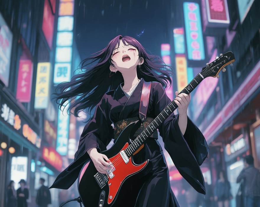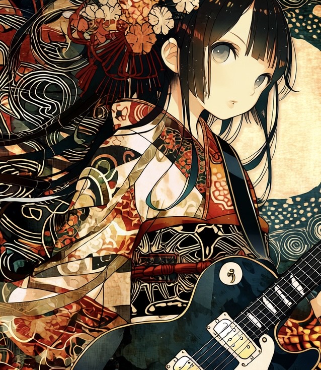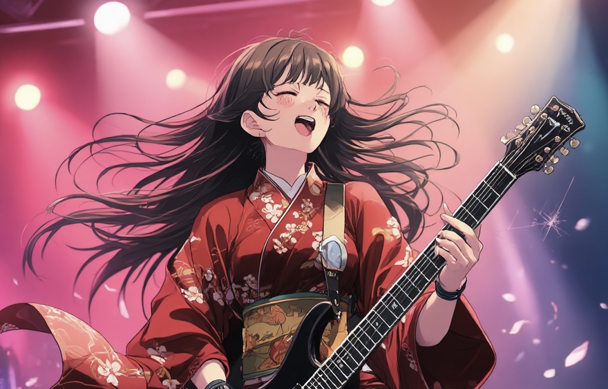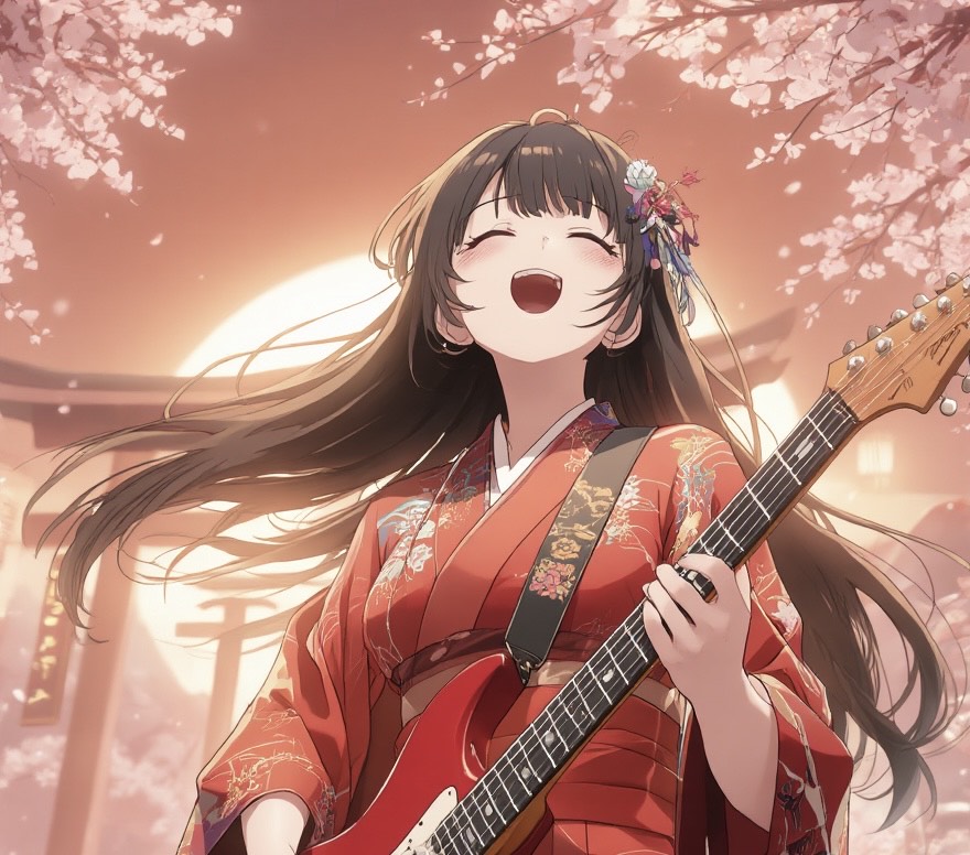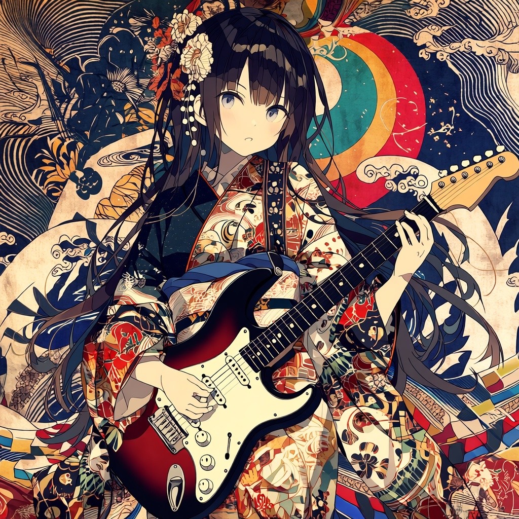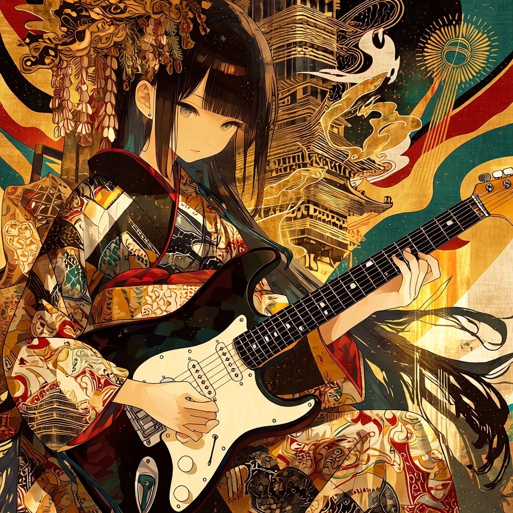 gagaku, Japanese string instruments, traditional Japanese instruments, metal guitar, progressive metal, female vocals, mixed voice, funky bass, high-speed tempo, passionate neoclassical electric guitar, 16 beats, japanese style, gagaku