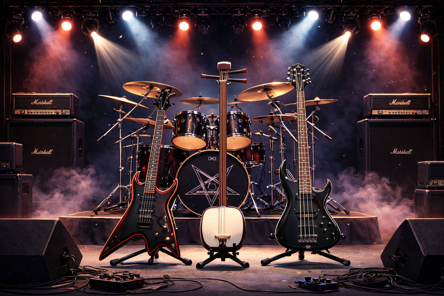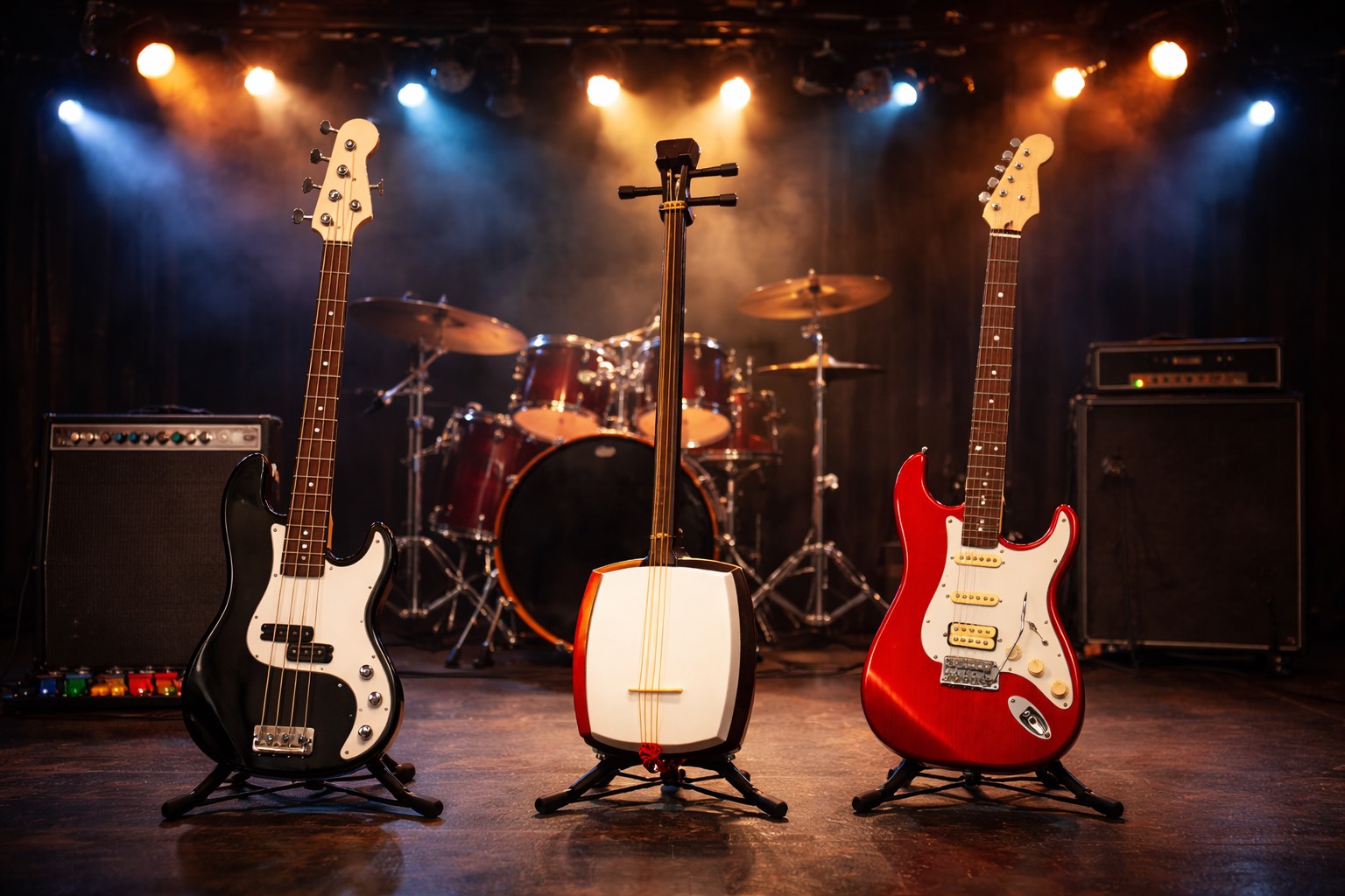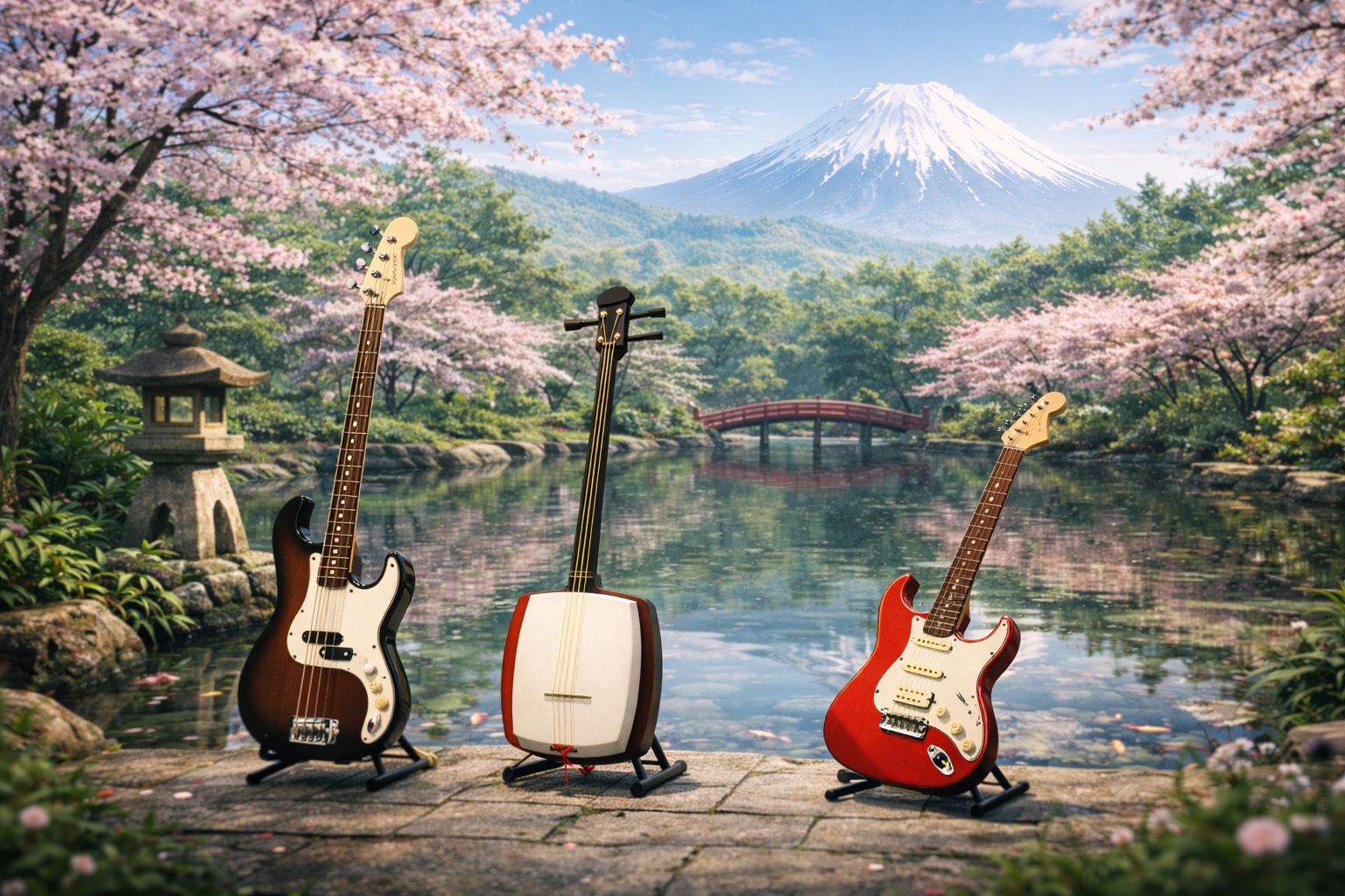 progressive rock, Hardcore Fusion, Distorted Electric Guitar, Funky Bass Groove, Aggressive Drums, Koto And Shamisen As Lead Instruments, Japanese Traditional Scale (Miyako-Bushi / In Scale), Instrumental Interlude With Koto, Shamisen, Guitar And Bass Trading Phrases, Emotional, Resilient, Powerful, Gagaku, Japanese String Instruments, Traditional Japanese Instruments, Guqin, Shamisen, Metal Guitar, Progressive Metal