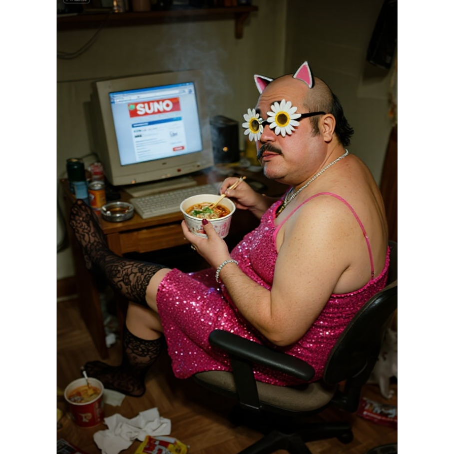 (Alternative hip-hop, lo-fi R&B, vaporwave-infused pop), (laid-back rap flow, spoken-singing delivery, playful phrasing, mantra-style chorus), (confident and ironic mood, dreamy late-night urban atmosphere, cosmic and detached), (lo-fi swing drums, ambient synth pads, reversed clock ticks, fuzzy 808 bass, glitchy vocal chops)