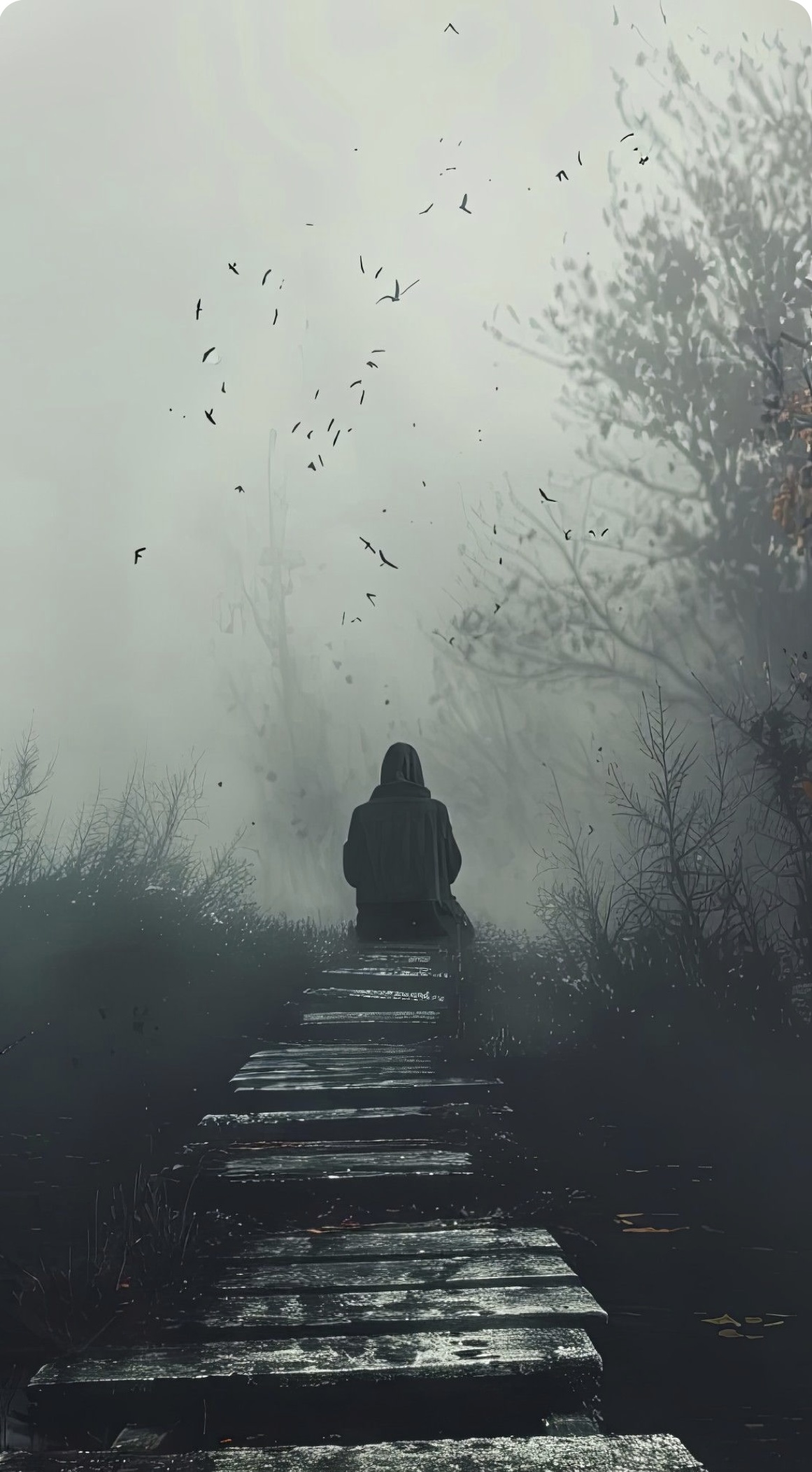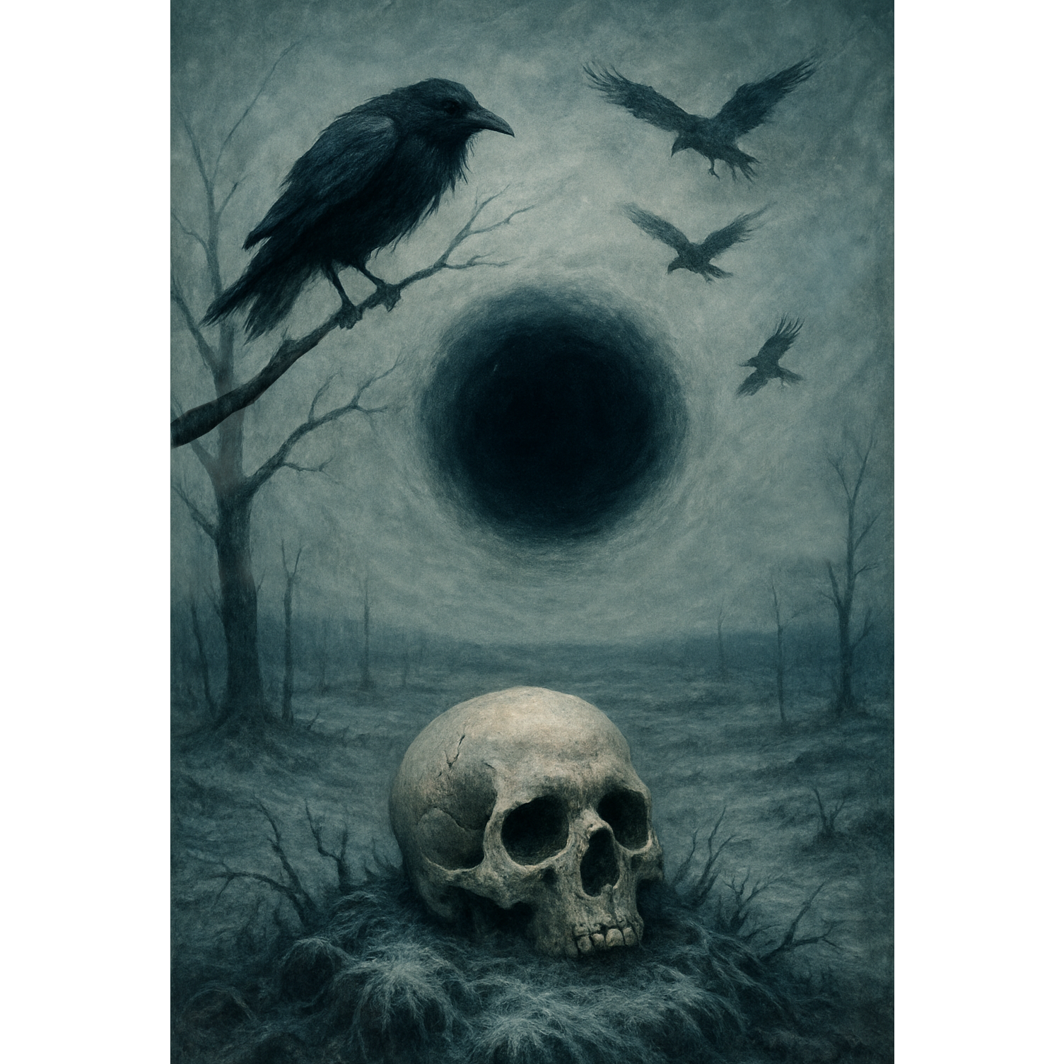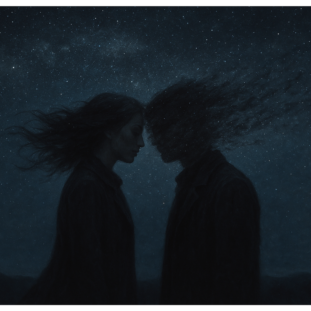 Death Doom Metal, Musical tone: 3/4 time slow-tempo doom metal with atmospheric layers, clean melodic female vocals contrasted by deep male growls, Gloomy, orchestral arrangements with reverb-laden guitars, piano or strings, and solemn choirs, Mood & imagery: dark romanticism, cosmic sorrow, death, loss, and spiritual desolation — beauty found in decay, The music feels like a funeral prayer whispered into a collapsing universe, Lyrical style: poetic, existential, and philosophical — exploring mortality, time, entropy, and the futility of divine meaning, Female voice: ethereal, sorrowful, melodic — represents the soul, memory, or human longing, Male growls: deep, resonant, representing nature, death, or inevitability, Occasional unison passages create a tragic sense of doomed unity