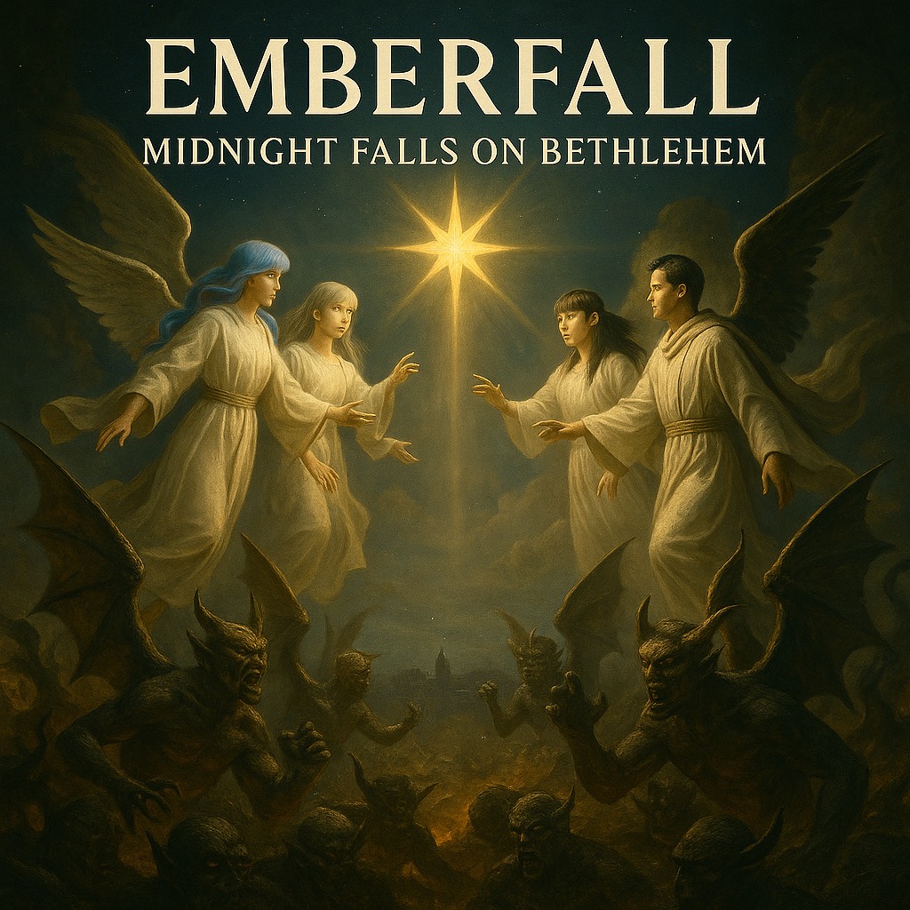 A massive cinematic metalcore Christmas finale in A minor at 150 BPM, Intricate guitars with tremolo-picking starlight effects, bright arpeggios, octave-lead melodies, and triumphant harmonized hooks, Rhythm guitars are heavy and tight with emotional chugs, Bells are a major feature: shimmering handbells, heavy cathedral bells, and star-like glockenspiel woven through verses, choruses, and breakdowns, Strings swell richly with staccato urgency in the bridge and cinematic pads in intros/outros, Kira leads with reverent clean storytelling and powerful soaring choruses, Mei adds high angelic harmonies and celestial countermelodies, Tatsu provides intense, emotional screams in the bridge, breakdown, and final chorus accents, Suzu-Chan adds ghostly whispers, ancient-choir textures, and ambient prayer-like layers, Mix wide, heavenly, and dramatic, evoking the sky opening over Bethlehem at midnight