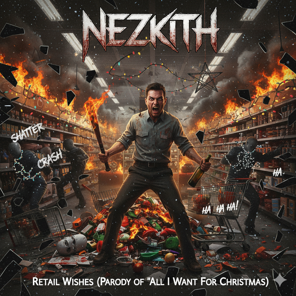 A furious Christmas parody in the style of Mariah Carey's "All I Want for Christmas Is You, " but twisted into unhinged retail worker rage, Start with upbeat, saccharine holiday pop cheer—jingly bells, festive piano, swinging drums, and glossy synths—then escalate into guttural metal screams, distorted guitars crashing in, heavy bass drops, and chaotic sound effects like shattering glass and maniacal laughter, Male vocals: forced jolly falsetto at first, devolving into snarling yells full of snark, profanity, and venomous hatred, Tempo builds from bouncy 150 BPM to frantic thrash, Overall vibe: holiday hellscape of entitlement-bashing fury, blending pop whimsy with punk rock aggression