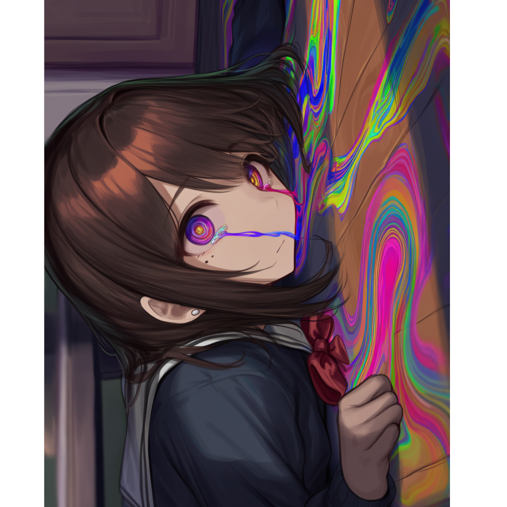 Modern J-Pop, Catchy Anime Song, High-energy, Dark Ambient textures, Eerie sound effects, ASMR elements, Glitchy, Hyper-pop, 140 BPM, Distant whispers, Electronic surveillance noises, Piercing synths, Melodic but unsettling, Rhythmical, contemporary, Weird