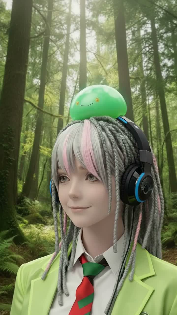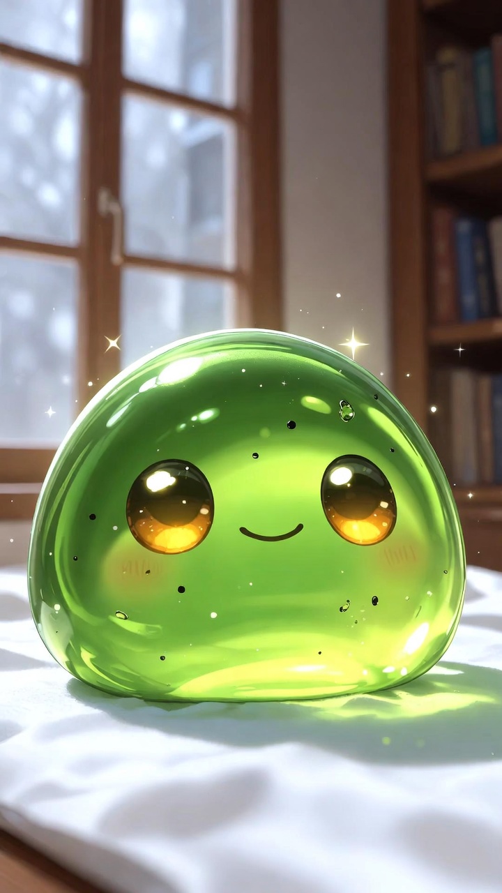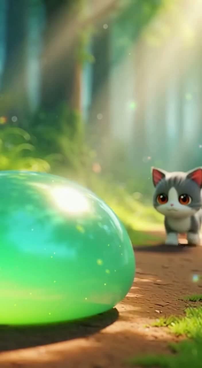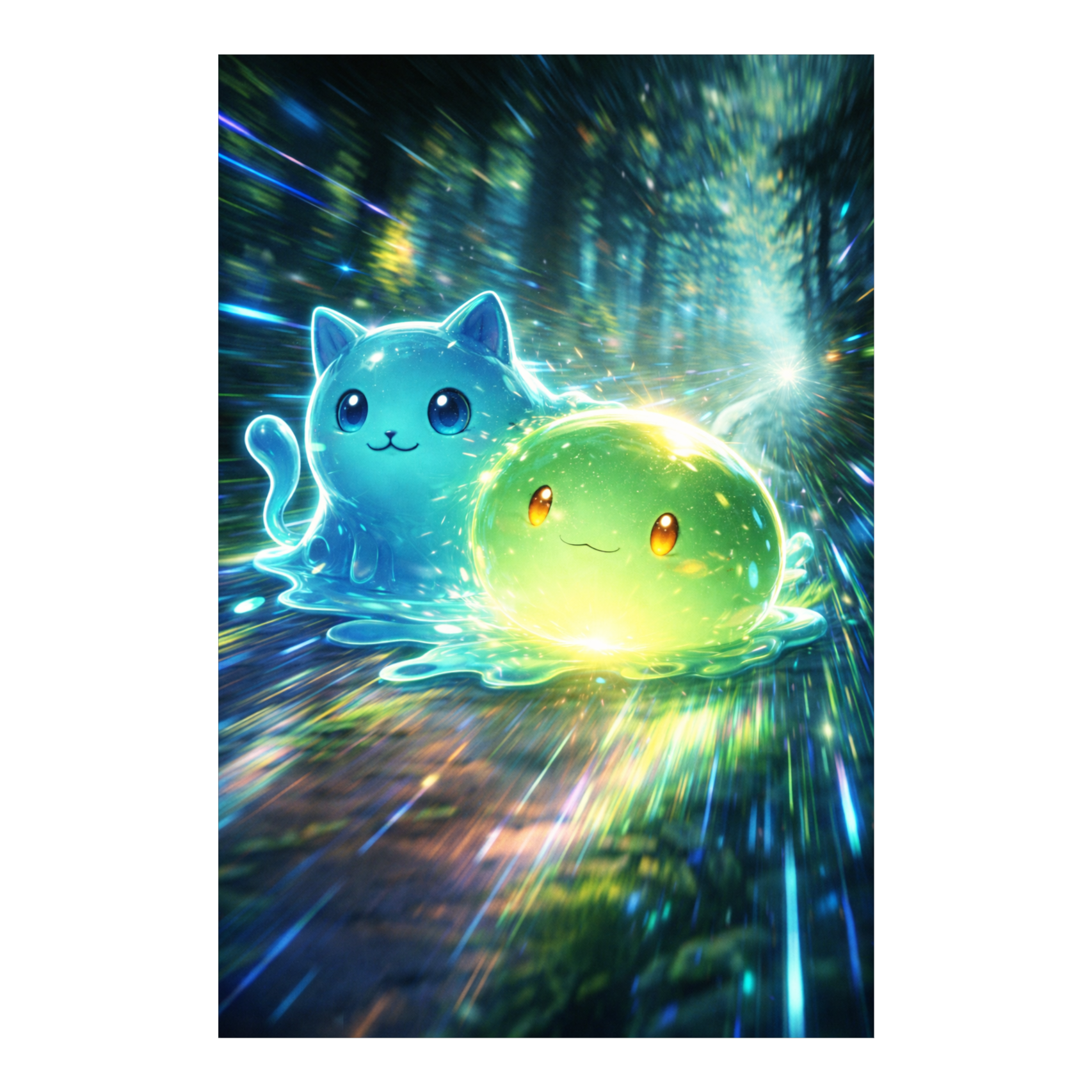 Warm, gentle fantasy symphonic J-Pop with cute cats and magical slime, Strings and woodwinds lead airy, soft melodies; harp, celesta, and glockenspiel add sparkling shimmer, Brushed percussion and soft timpani maintain cozy rhythm, Vocaloid female voice is crystalline, breathy, watery/slime-like, soft, tender, playful, with childlike warmth (F0 ~280Hz), gentle vibrato 4–6Hz, and soft squishy formant bounce; clear in Japanese, without harsh highs, Orchestral swells highlight pre-chorus and chorus, creating dreamy peaks, Overall feel: soft, sparkling, magical, immersive, playful, heartwarming, and slime-character infused, aligned with 120BPM J-Pop phrasing
