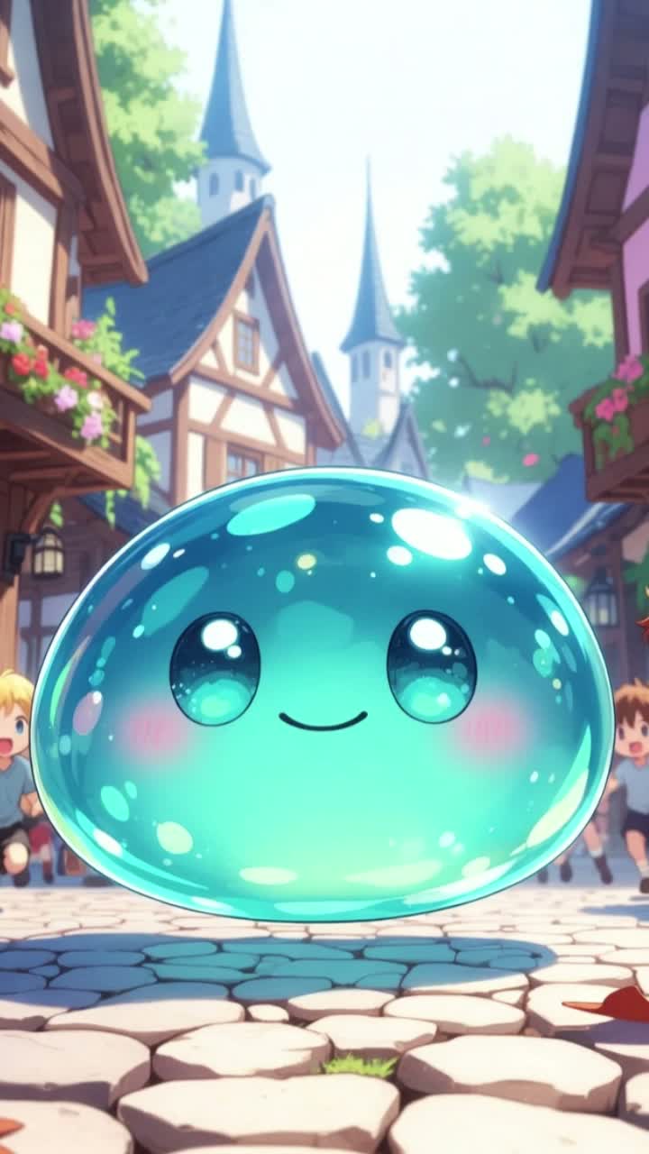 A hero wakes up and finds himself transformed into a slime, fantasy, sad, hopeful, cinematic, whimsical, quirky, adventure, cuteness, bubbling sounds, sense of speed