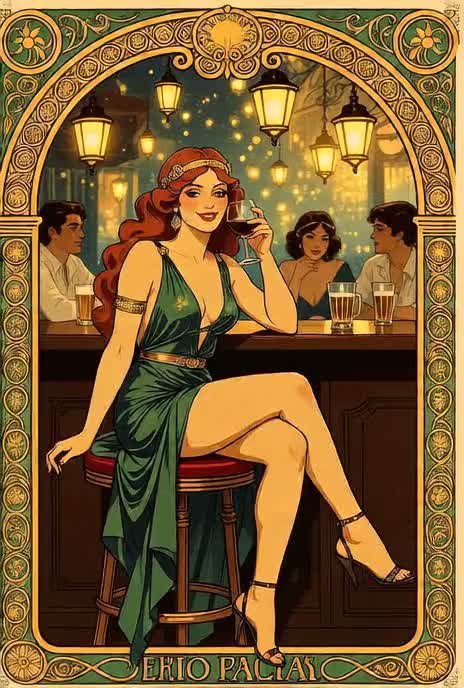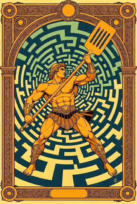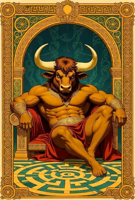 Over-the-top cabaret-glam-rock with bardcore instrumentation, theatrical narration, and playful camp, Vocals alternate between sardonic male narrator (baritone/tenor), mischievous female lead (Ariadne, alto/soprano), and a cheeky Greek chorus with sarcastic asides, Instrumentation blends lute, hurdy-gurdy, marimba, hand percussion, glockenspiel, and whimsical chimes with glam-rock electric guitar flourishes, echo, and reverb to evoke labyrinthine menace, Medium tempo, swinging between suspenseful tension and flamboyant comedy, with dramatic pauses and exaggerated camp gestures, Mood is witty, flirtatious, absurd, and mythic, like Rocky Horror meets medieval tavern chant, Includes theatrical narration, tongue-in-cheek humor, glam solos, and audience-interactive choral echoes, Climactic energy balances suspense with cabaret excess, pushing the myth into playful glam extravagance