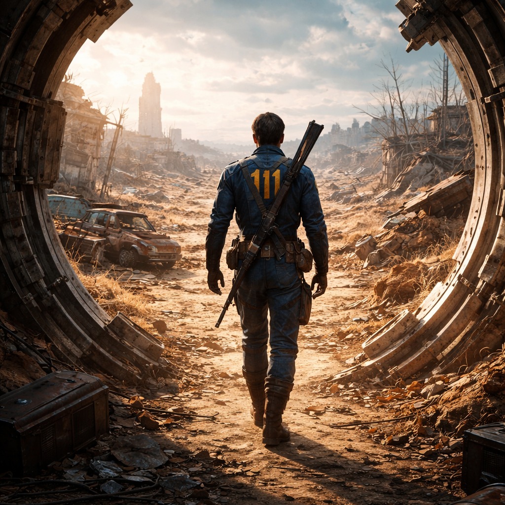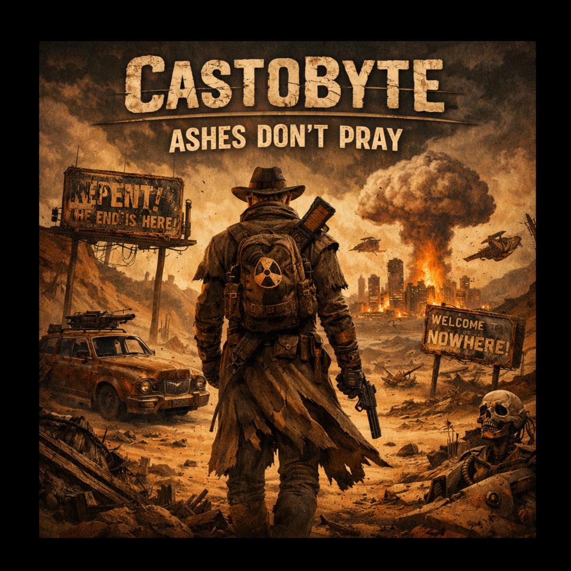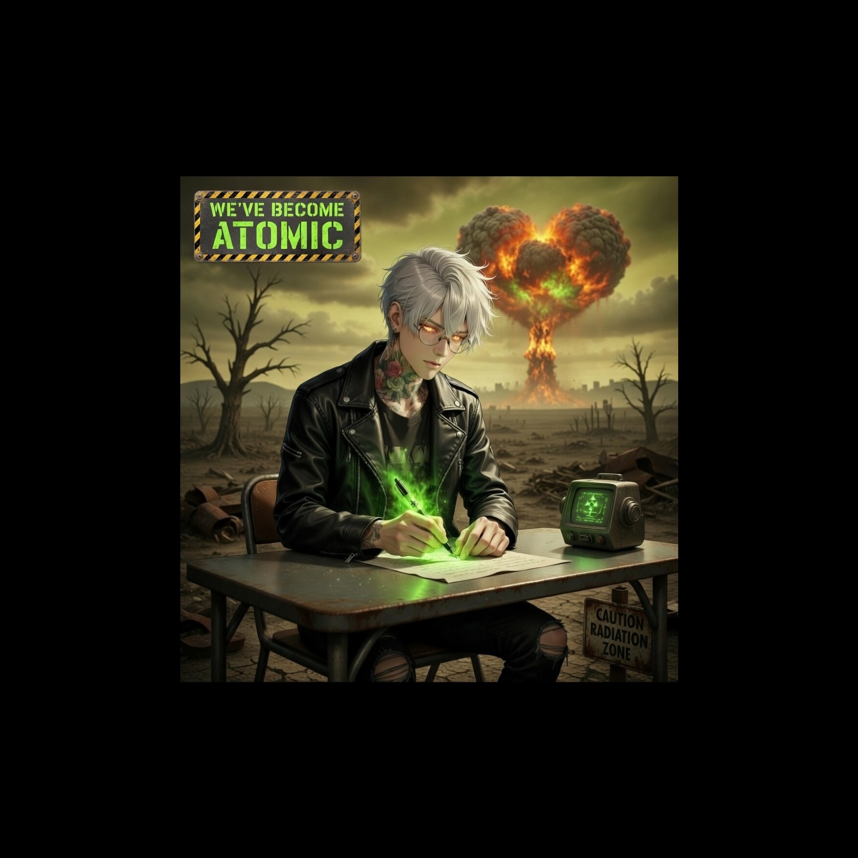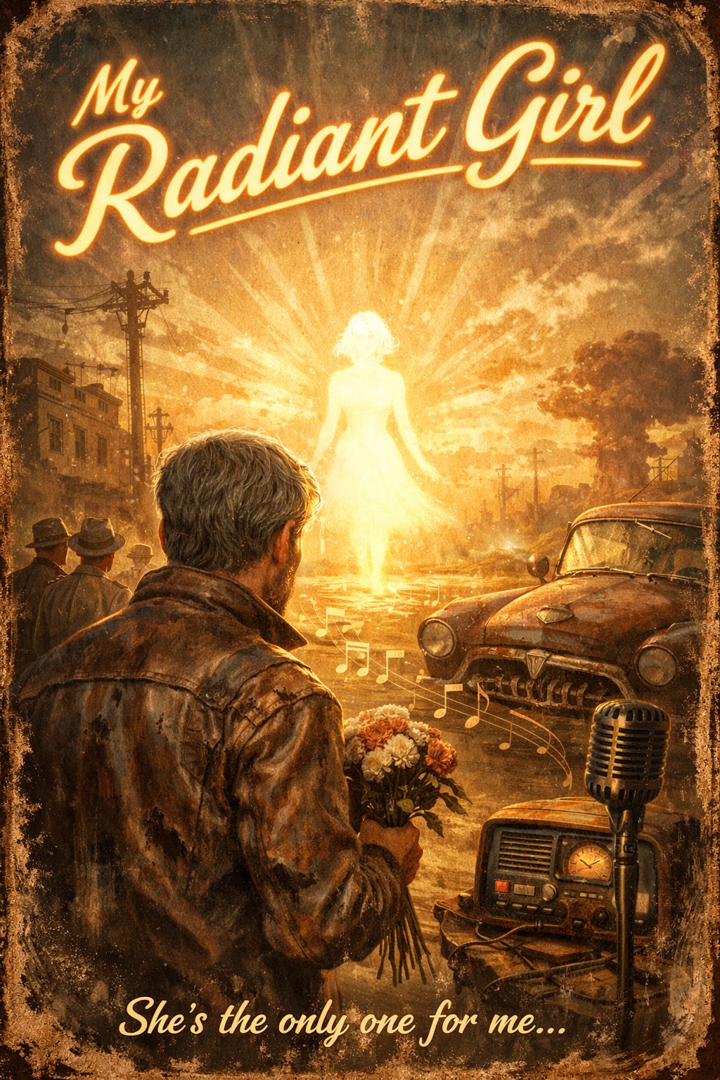 Epic emotional rock ballad with retro-futuristic wasteland atmosphere, Slow build intro with distant ambient pads, lonely piano notes, and soft analog synth textures creating a desolate radioactive landscape feeling, Gradually introduce deep cinematic drums, swelling strings, and powerful electric guitar that grows into a massive emotional chorus, The song should feel like longing across a ruined world β melancholic but hopeful, Strong soaring vocals full of emotion and intensity, slightly gritty but heartfelt, Verses intimate and spacious, chorus huge and explosive with layered guitars and orchestral backing, Subtle Geiger-counter-like ticks and vintage radio ambience in the background to evoke retro nuclear-age atmosphere, Dramatic dynamic contrast: quiet reflective verses, thunderous arena-scale chorus, Style: cinematic rock ballad, post-apocalyptic romantic anthem, powerful emotional delivery, slow to mid tempo, rich reverb and wide soundstage