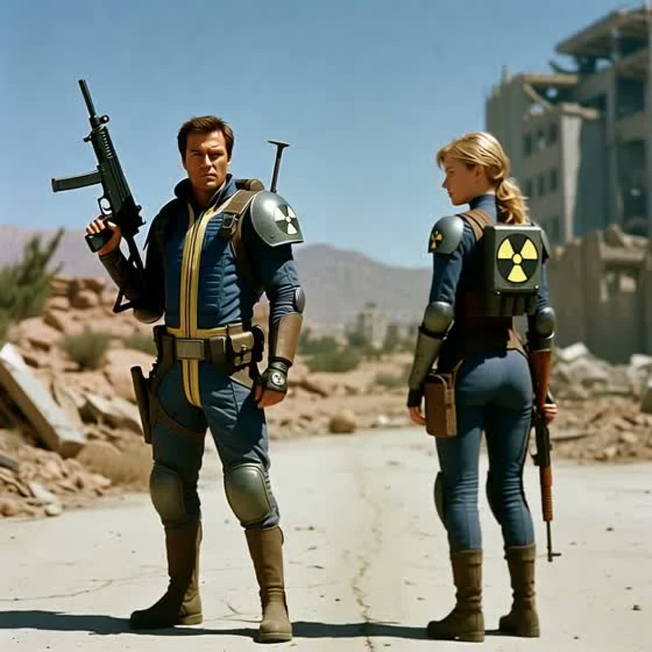 [Modern Electro Pop + Synthwave, 120-130 BPM] Female vocal very similar to Debbie Harry'S (Blondie'S): cool husky elegant pop-rock tone, emotional but controlled, vintage 80s new wave style, clear pronunciation, slight sexy rebellion with soft background harmonies, Theme: Cinematic Fallout-style wasteland romance, neon radiation world, adventurous epic but fun futuristic tone, no real world references, Sound: Sharp electronic drums, trap hi-hats, deep synth bass, retro-futuristic synthwave pads, bright lead synths, add radio static FX and wind intro, Structure: Intro atmospheric β Fast rhythmic verse β Rising pre-chorus tension β Big catchy chorus alternating βFalloutβ and βCall meβ β Post-chorus synth hook β Second verse harder percussion β Final chorus epic reverb layered vocals cinematic ending, add EDM drop energy after choruses, arpeggio synth rises, danceable viral modern pop storytelling