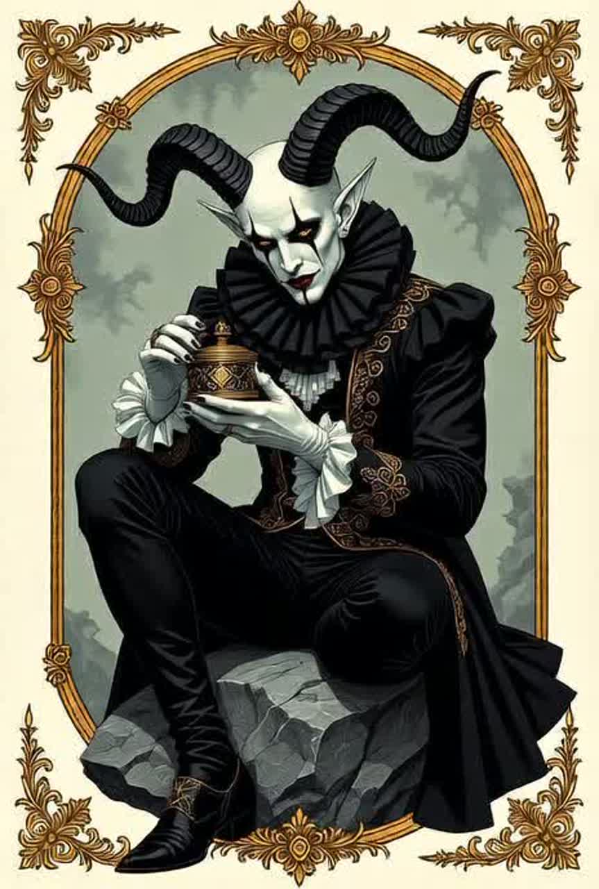 a dark, barock theatrical cabaret track for a grotesque, absurdist song Male falsetto vocals chant verses with dramatic expression, accordion and upright bass provide eerie, minimalistic accompaniment, Include sparse percussion, occasional dissonant strings, and carnival-like flourishes, The mood should be simultaneously macabre, humorous, and grotesque, Cinematic, theatrical climax at the final chorus, theatrical, expressions dramatic and evil mockery