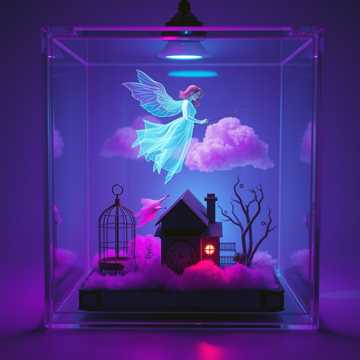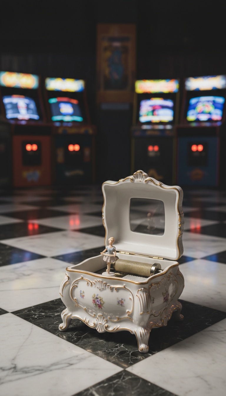 haunted female vocal, opens with a lonely music box melody, layered with detuned notes and subtle mechanical whirrs, Uneasy strings and distant, echoing chimes slowly build, blending in unsettling atmospheric textures and low, pulsing synths, At the climax, sharp percussive hits and eerie reversal effects heighten the terror