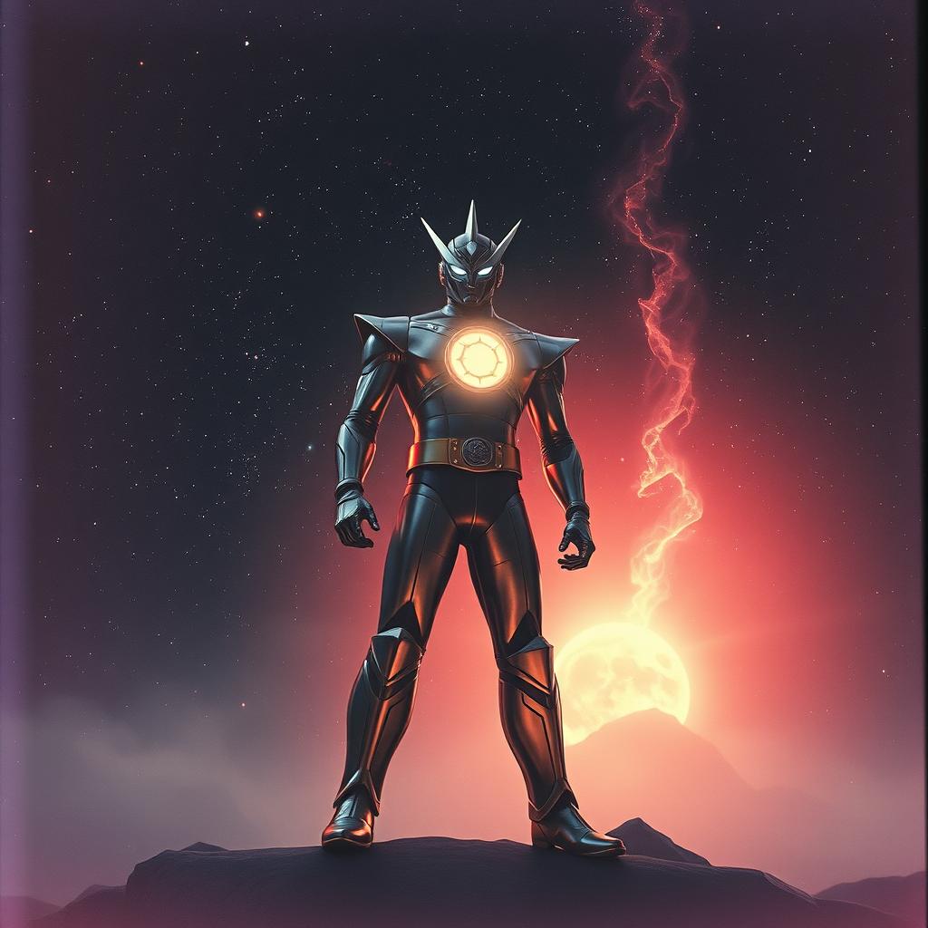 J-Rock, anime opening, energetic male vocals, Energetic Japanese superhero theme song, tokusatsu style, similar to Ultraman opening themes, heroic rock orchestra fusion, tempo 150 BPM, major key, big chorus hook, layered choir, soaring lead vocal, electric guitar riffs, symphonic strings, brass hits, taiko-style drums, space and galaxy atmosphere, emotional and inspiring, lyrics about shining light, bonds, destiny, and protecting the world