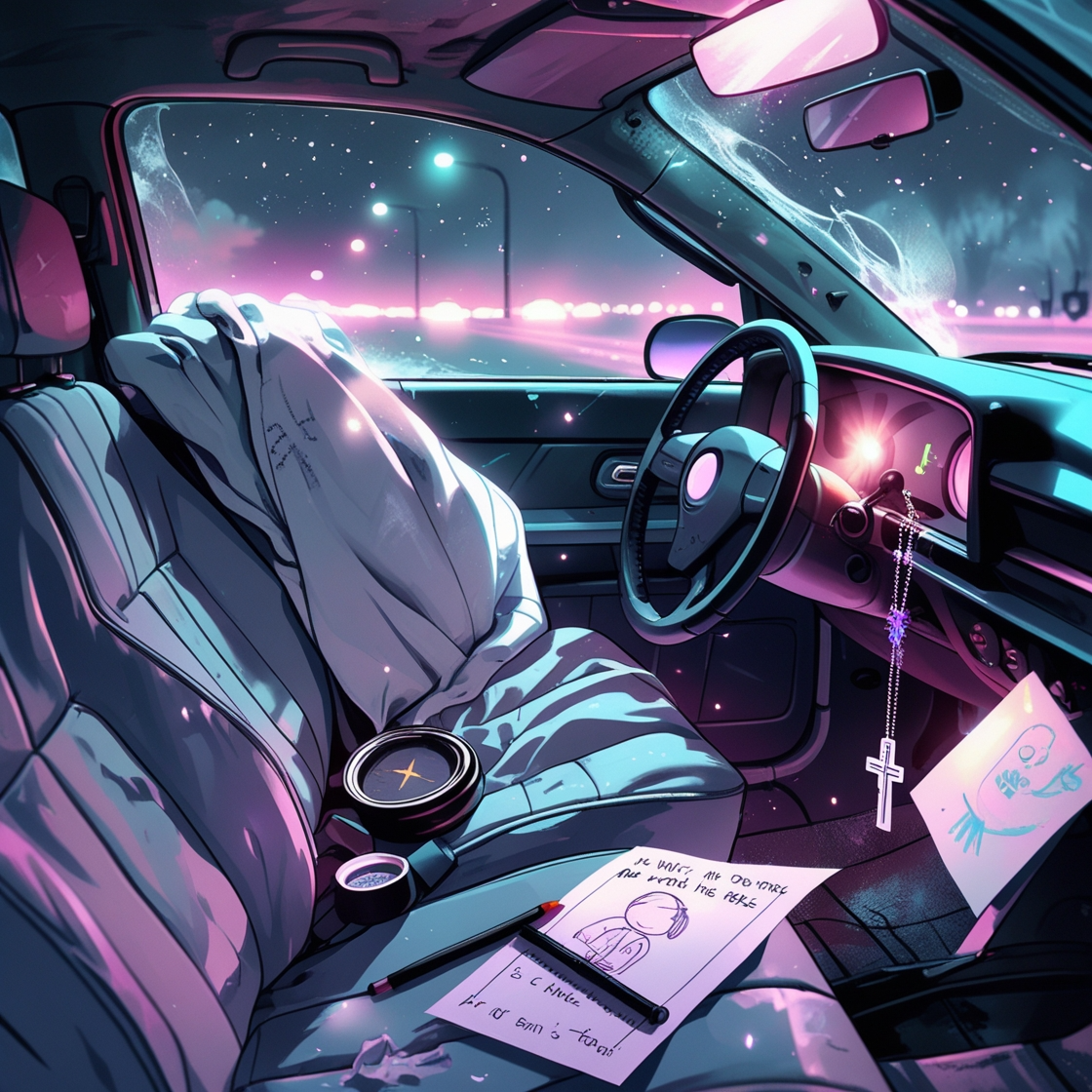 Key Instruments: ambient car textures, lo-fi piano, cigarette ember crackles, slow pulsing bass, vocal chops, vanity mirror FX shimmer