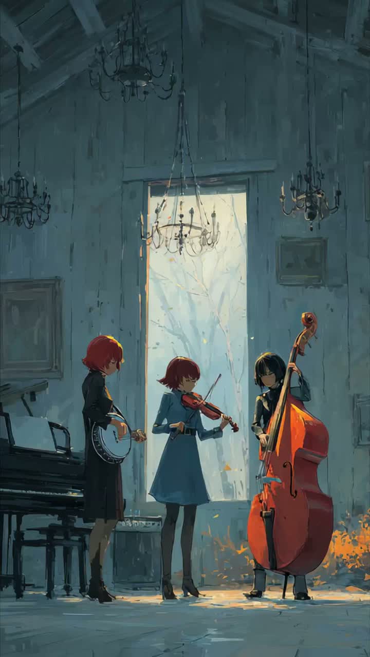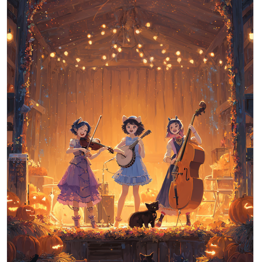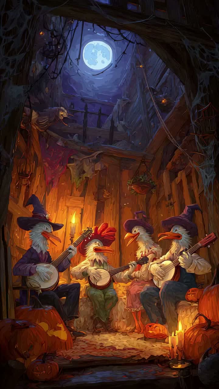 Live bluegrass band, female lead, natural mic bleed, barn ambience, spontaneous laughter and short, Tempo: 120–130 bpm, driving but human groove, playful theatrical energy, light reverb from wooden walls, faint audience chair creaks, Banjo (5-string): rhythmic rolls, syncopated fills, slight mic bleed, quick jokes or laughter, Acoustic guitar: percussive strumming, palm-mute in verses, open chorus chords, warm body tone, spontaneous chuckle between lines, Upright bass: woody pluck, classic 1–5 walk, comic timing with lyrics, slight foot-stomp bleed, Mandolin: bright chops, short tremolo, cheerful call lines, Fiddle: melodic replies, expressive slides, duet laughs in bridge, Energy builds: verse 1 intimate, bridge adds banjo-fiddle solo trade, Mood: uplifting, spontaneous, humorous rural-night euphoria, ghost-story parody, Avoid: drums or synths — keep 100% acoustic, Vocal: bright soulful female lead, natural twang, expressive phrasing, playful banter with bandmates