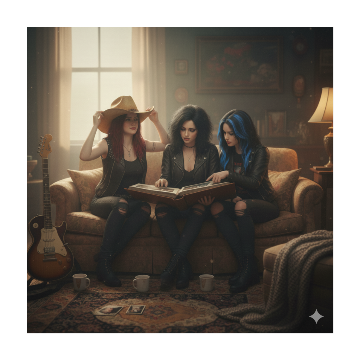 big distorted guitars, pounding drums, dramatic vocals, Campy, theatrical, gritty, Energetic, rebellious, swaggering, with playful attitude, Bold riffs, flamboyant solos, and an anthemic chorus full of power