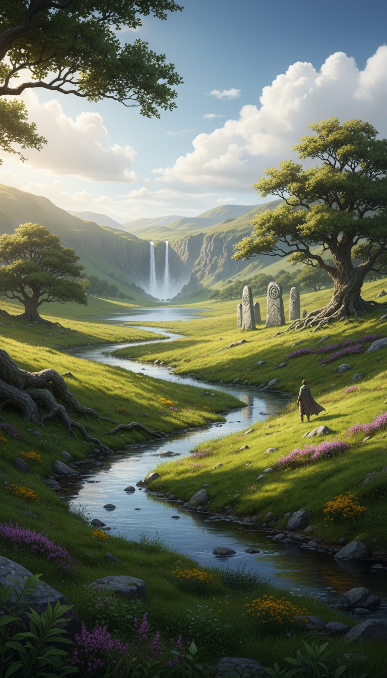 Celtic fantasy folk, Dorian mode, ethereal and transparent female vocal, mystical but gentle atmosphere, tin whistle, harp, fiddle, soft choir pad, acoustic guitar, cinematic ambience, peaceful field journey feeling