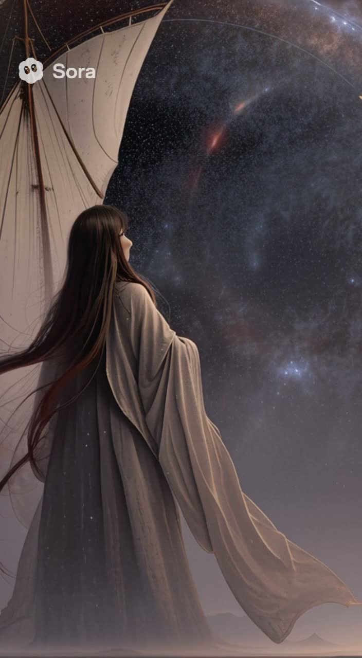 Create a slow, atmospheric space sea shanty with a haunting, drifting feel that evokes inevitable decay and fragile existence, Use a calm, restrained male lead vocal in baritone or airy tenor, layered with distant, ghostly crew chants, Blend traditional instruments—distorted fiddle, sparse minor acoustic guitar, haunting accordion pads, deep cello drones—with subtle futuristic textures like glitchy static, warped percussion, and ambient drones, Maintain a steady 80 BPM in 6/8 time with a gentle, swaying rhythm, Begin sparsely with solo fiddle and whispered spoken words, gradually build layers that slowly fracture and dissolve, including extended instrumental solos and meditative silences, Keep dynamics smooth and fragile, avoiding sharp crescendos, End abruptly with whispered phrases and sudden silence, like a lost cosmic transmission, The tone is cold, distant, and spectral, reflecting an endless unraveling void