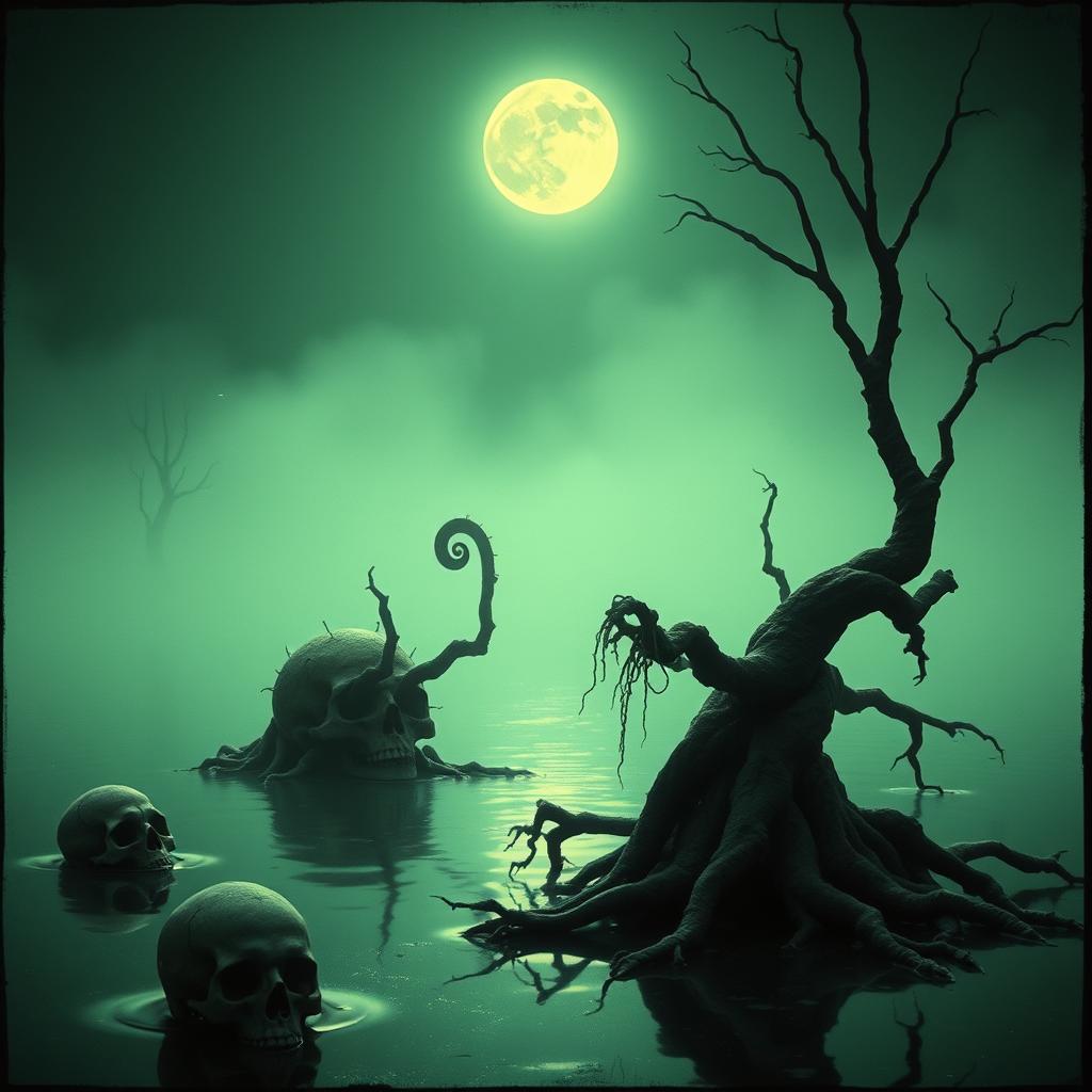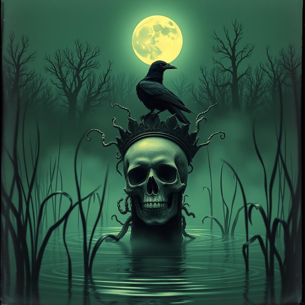 A Powerful Horrorcore/ gothic metal/doom rock/darkwave piece with deep dark echoing male vocals with dramatic vibrato, intro is slow with spoken horrorlike words, hypnotic strong death metal guitar riffs, agressive deep damatic female vocals at the background, acoustic guitar, Violin, deep piano, deep cello, electronic, echoing deep synth, dramatic, mediavel vibes, nu metal atmospheric, Deep bass, tablas, dark cinematic atmosphere, slow growling outro, powerful drums