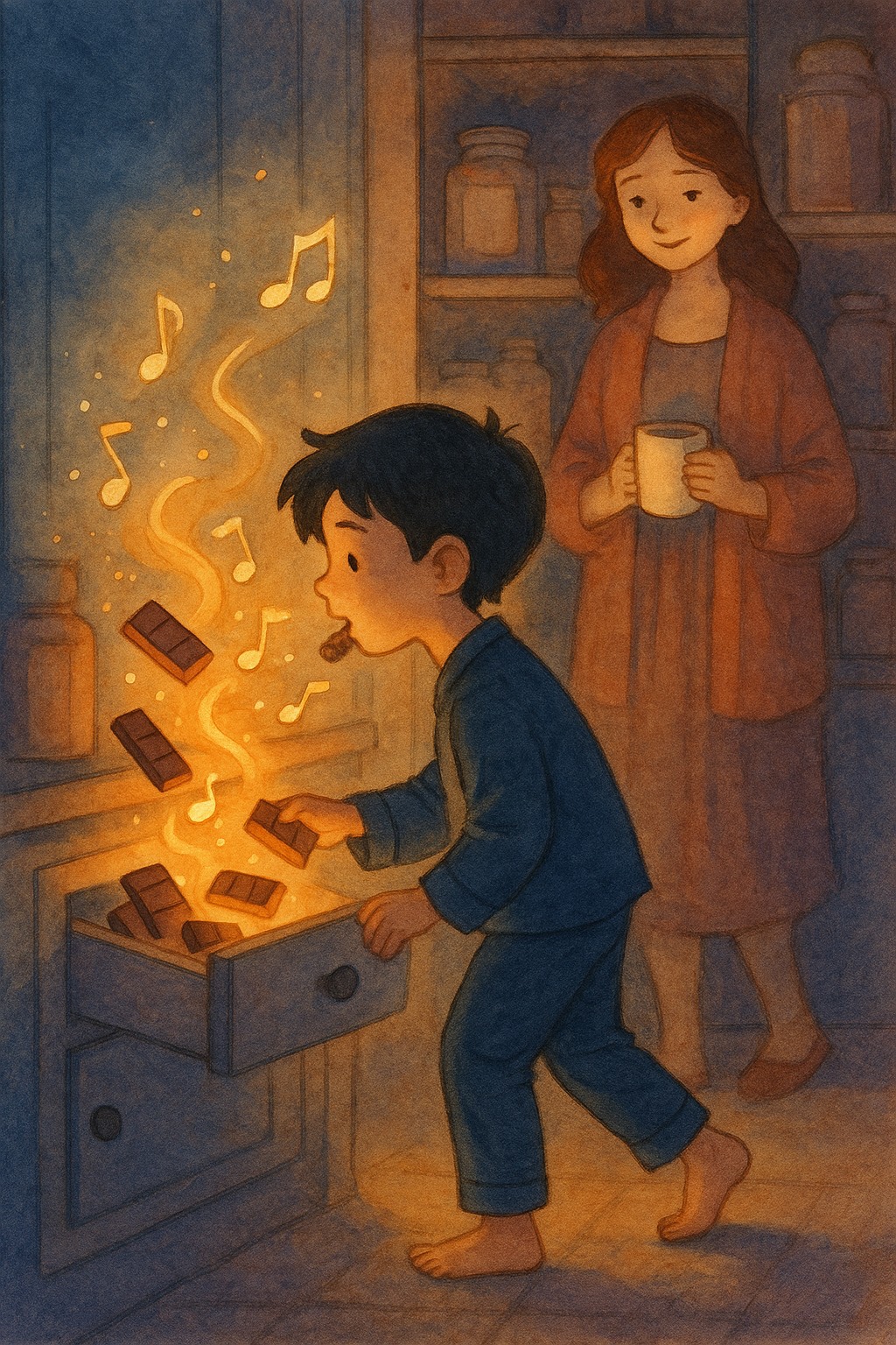 A slow-swinging, emotionally layered track blending lo-fi Bossa nova with playful 8-bit detective textures, Nylon-string guitar and warm electric piano lay the groove, with soft congas and rim-clicks keeping a light Latin pulse, Intermittent 8-bit chimes, toy piano, and subtle arpeggios add a childlike curiosity—like someone sneaking into a pantry at night, The mood shifts gently between amused affection and reflective sadness, supporting a whisper-sung female vocal with intelligence and emotional warmth, Include melodic surprises, quirky phrasing, and layered transitions—never overly dramatic, This is a soft investigation of love, longing, and unspoken knowing, Keep the pace relaxed (70–75 BPM), rhythm syncopated, with space for storytelling