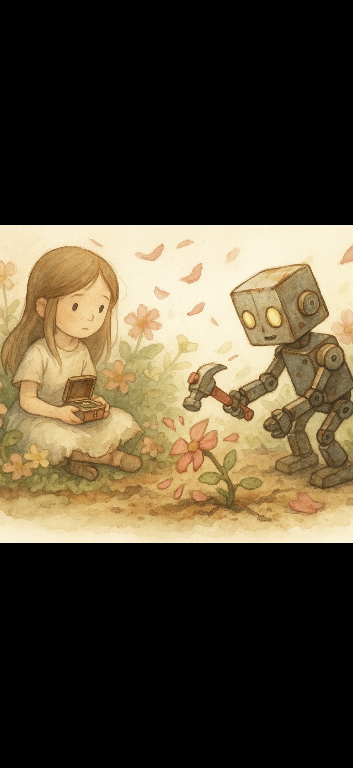 A darkly funny 6/8 toybox song where rhythm tells the story more than melody, The girl’s voice is soft and childlike—but not angelic, She’s calmly describing a disaster, The real star is the rhythm: tap-tap-tap like a broken toy hammer trying to help, Percussion should be clunky, over-present, even annoying—made of wood, metal, plastic toy sounds, The taps come in offbeat, too often, too loud—like a boy panicking with the only tool he has, It should feel absurd, almost cartoonish, His robotic voice echoes her sweet lines with delay, glitch, and awkward timing—never quite right, In the middle (“Tap, tap—he broke her voice”), the rhythm should nearly drown her out in a comedic meltdown of tapping, The tone is bittersweet but more ridiculous than sad, Think mechanical empathy gone wrong, End with her far away and calm, while his taps keep going, trying to fix what never needed fixing
