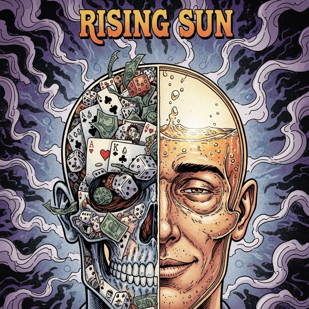 Dark trap-folk hybrid with acoustic banjo, ambient synths, and 808 sub-bass, 78 BPM, F minor, Female vocal, intimate and slightly distorted, Verses are soft and eerie, chorus hits with hard bass drops and harmonies, Glitch effects and ghostly texture, Inspired by doom Americana, Mood: haunting, seductive, dangerous, Title: “Rising Sun”
