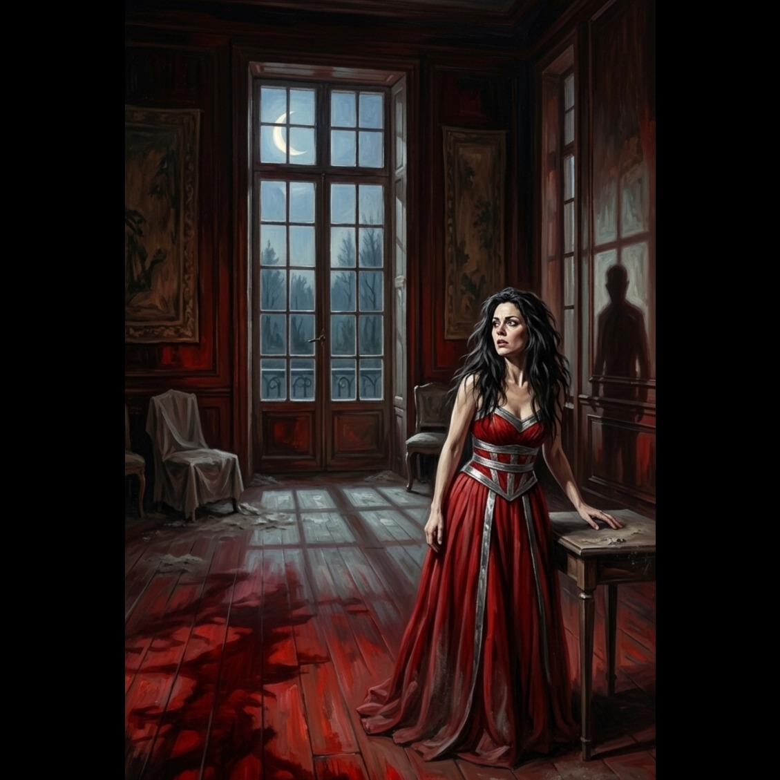 A dark synth-pop and industrial-influenced track featuring a driving 120 BPM four-on-the-floor electronic beat, The arrangement is built around a pulsing, distorted bass synthesizer and shimmering, minor-key arpeggiated synth leads that create a gothic atmosphere, The female vocals are haunting and ethereal, utilizing heavy reverb and delay to sit deep within the mix, The song structure follows a traditional verse-chorus-bridge format, with the energy building through the addition of layered percussion and aggressive, buzzing synth pads in the chorus, The production is polished and cinematic, emphasizing a wide stereo field and high-frequency clarity in the electronic textures