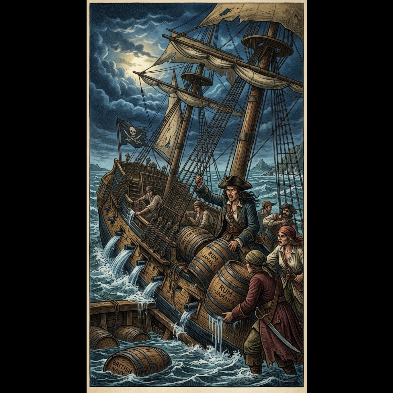 Sea-Shanty and Industrial; Hybrid Moroder Pulsating Bass and deeper sub-bass for added weight; cold female vocals slightly distorted through ringmodulator (frequency 30 Hz) and through 8bit-Bitcrusher and use vocal fry; chorus by female choir with rough voices and echo effects; cello for string sections, harp arpeggio, synthesizer echo; end song with last shout of "rum" in final Chorus
