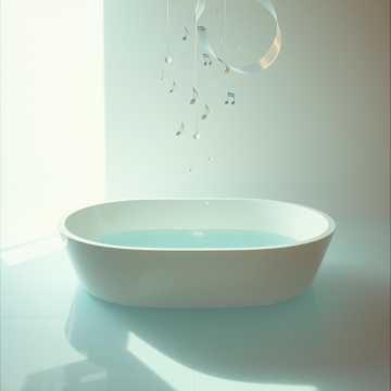 (water sound) sound of water dropping in the bath tub, soothing synths, strings, flutes, harps, high pitch opera voices, lyrics sync with musical movements