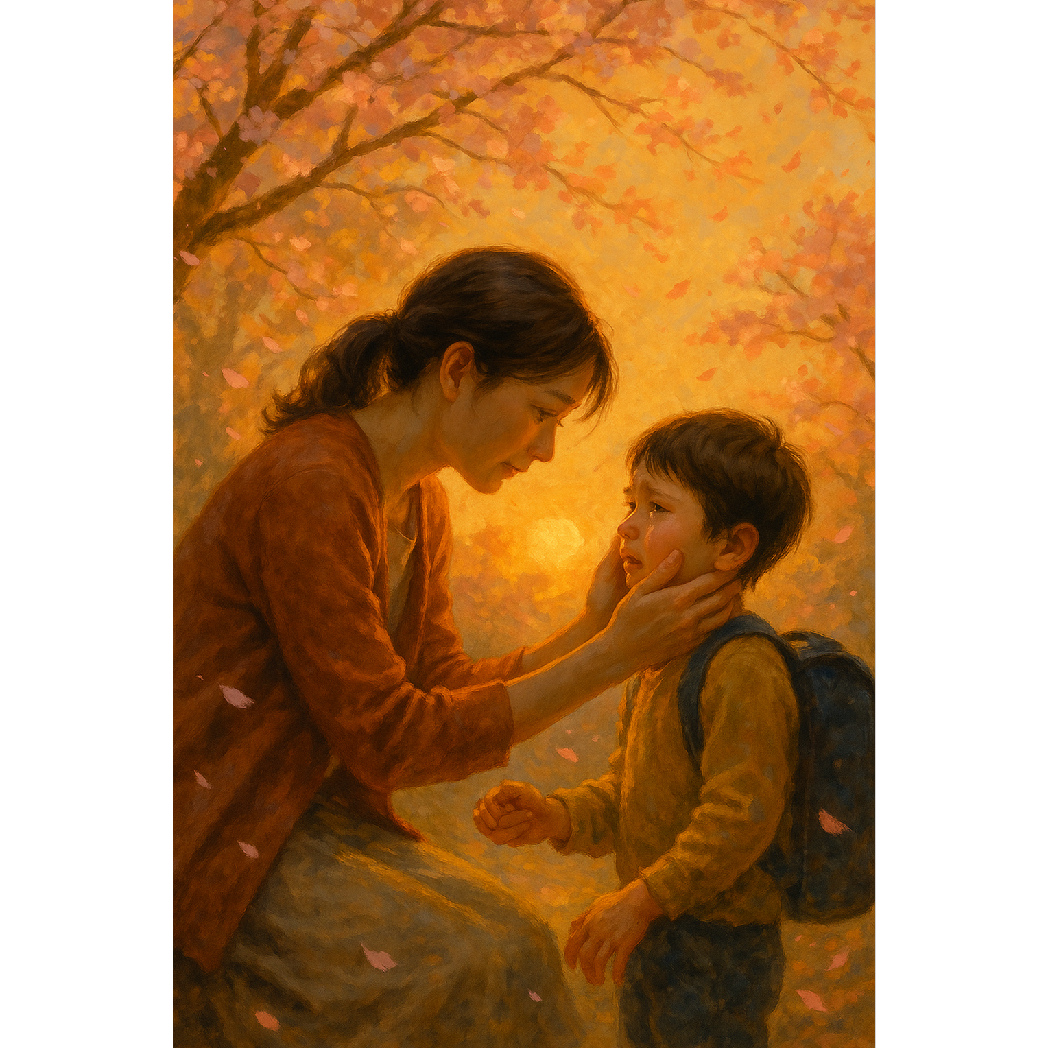 “Highly dramatic cinematic spring ballad, Warm piano intro → swelling strings → emotional orchestral build → impactful drums and powerful chorus, A song that expresses childhood pain turning into strength, the dramatic warmth of a parent’s embrace, and the moment kindness blooms from suffering, Tearful, intense, uplifting, A dramatic movie scene brought into sound, ”