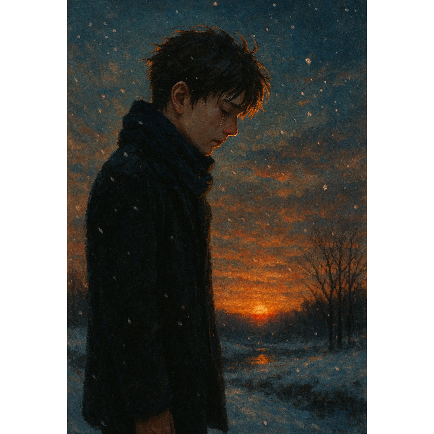 “Ultra dramatic cinematic ballad, Cold winter atmosphere, emotional piano, deep cello, swelling orchestral strings, atmospheric pads, powerful drums, A heartbreaking and uplifting soundtrack expressing teenage loss, winter silence, grief, unanswered questions, and the moment pain turns into strength, Tearful vocals with soft verses → explosive emotional chorus, Movie-level emotional storytelling, ”