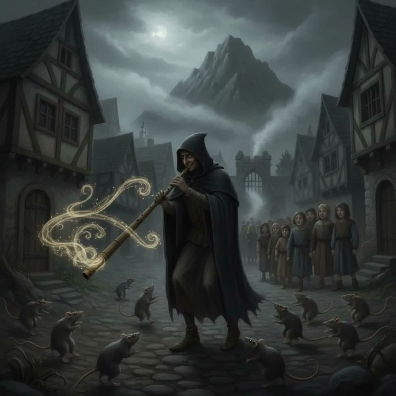 simple children's song melody with glockenspiel, harmonium, and a lonely wooden flute, haunting choir, eerie atmosphere, minimal arrangement, dark folk