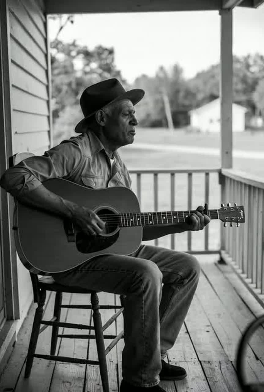 Dusty delta blues at 432hz, fingerpicked resonator guitar and stomping foot on a wooden floor, male vocals rough and intimate, Verse stays low and conversational, chorus opens with a gravelly shout and simple call-and-response backing hums, Occasional slide guitar moans and a lonely harmonica answer the vocal lines, Mix feels raw and front-porch, with roomy ambience and a slow, swaying groove, delta blues