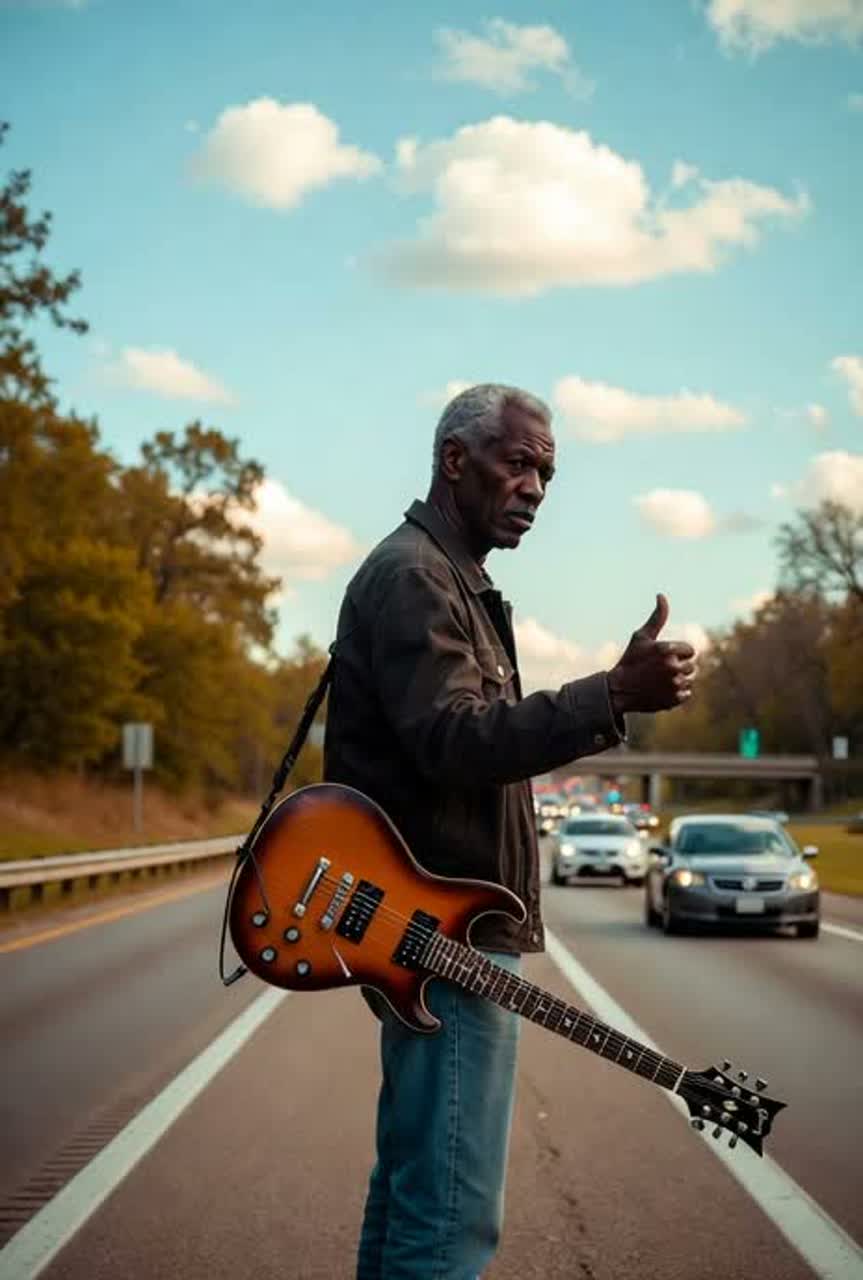 Texas blues, electric guitar with gritty tube amp, slow-to-mid shuffle, expressive bends and vibrato, warm walking bass, loose live drums, male vocal with grit and restraint, roadside bar atmosphere, dynamic swells, raw and unpolished, long guitar outro
