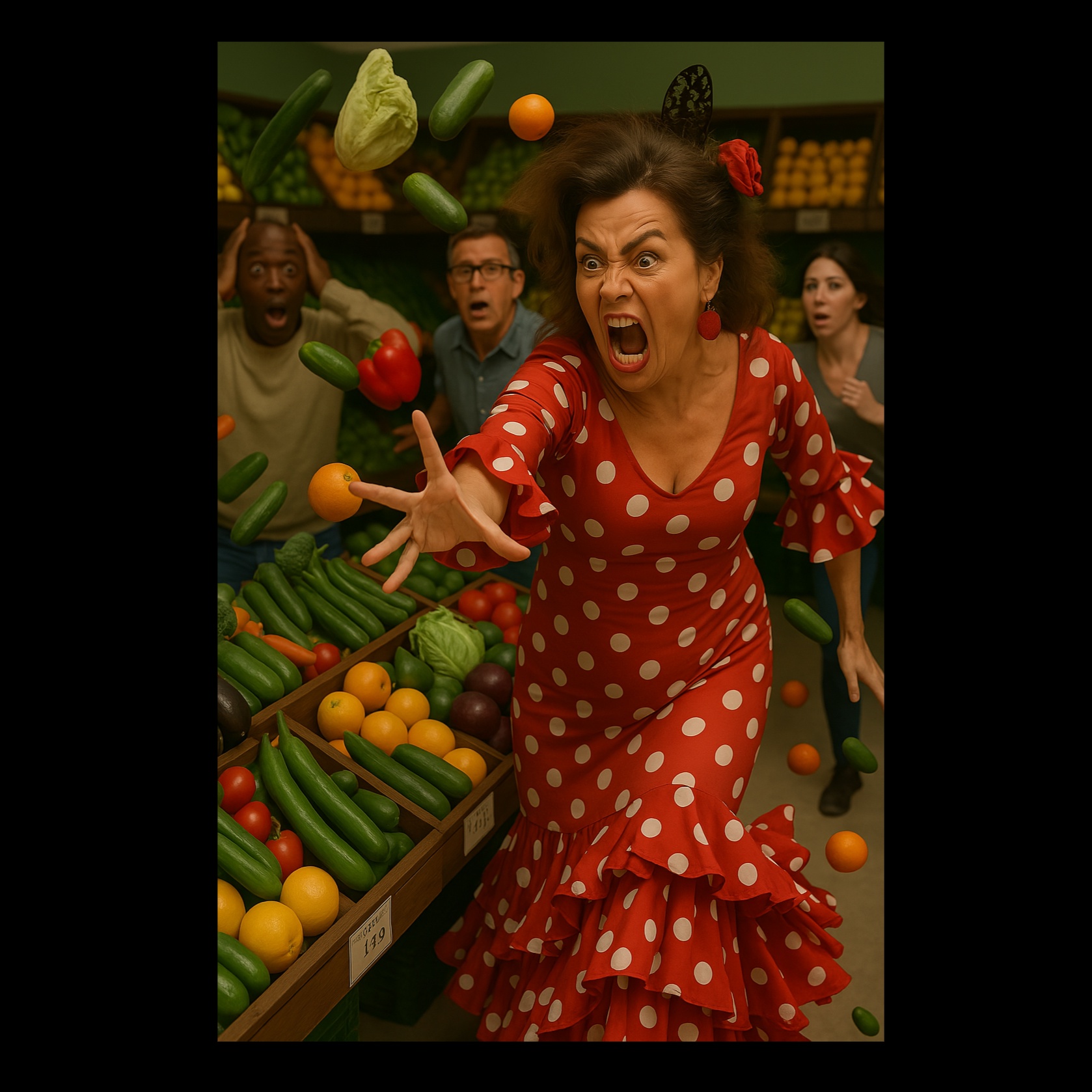 Copla andaluza alegre, con orquestación, estilo copla de los años 60, Voz femenina teatral y dinámica, representando a una mujer alegre, pero enfadada, casi como si estuviera loca, perfecta para copla andaluza, Pausas dinámicas para lucir la voz, Final apoteósico