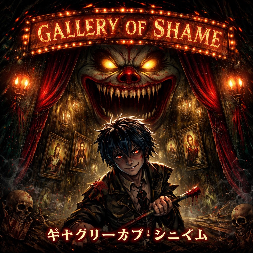 Uncanny Oscillations, Alien Timbre Field, An Unusual Ethereal Alien-Sounding Man Sings, A Cascade Of Humming And Sounds Like Rain Pouring Down, Be Abstract, Be Unusual, Short Sentences Only, Male Vocals, Unusual, Vocaloid1, emo, Male Vocaloid vocals only, Extreme horror emo carnival song, 145 BPM, Dissonant calliope, broken music box, warped accordion, screeching strings, distorted bass, pounding drums, Unsettling circus atmosphere, grotesque and theatrical, Lyrics about a cursed “Gallery of Shame, ” guilt as a haunted attraction, sins screaming from frames, Maniacal verses, whispered paranoid bridge, screaming layered chorus, glitch stutters, sudden dropouts, demonic laughter outro, Japanese lyrics, Cold, unhinged, nightmarish, Autotune Vocaloid, ‑Female