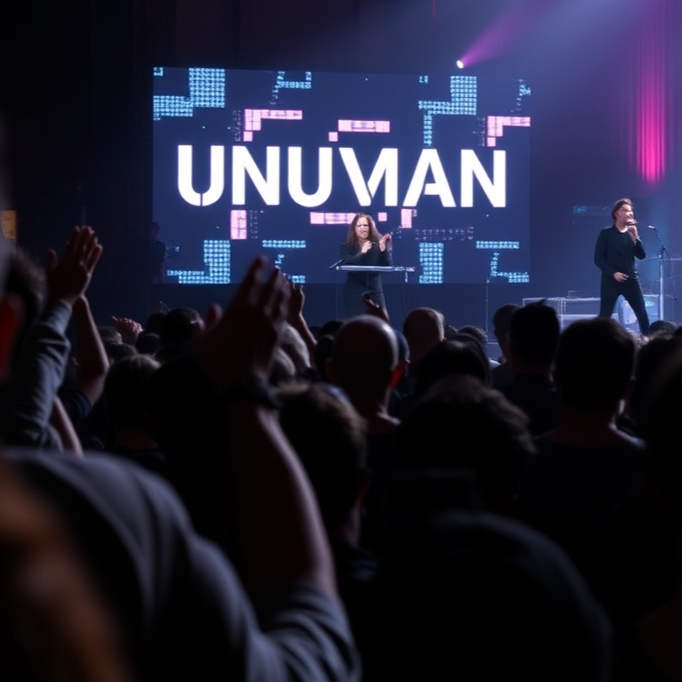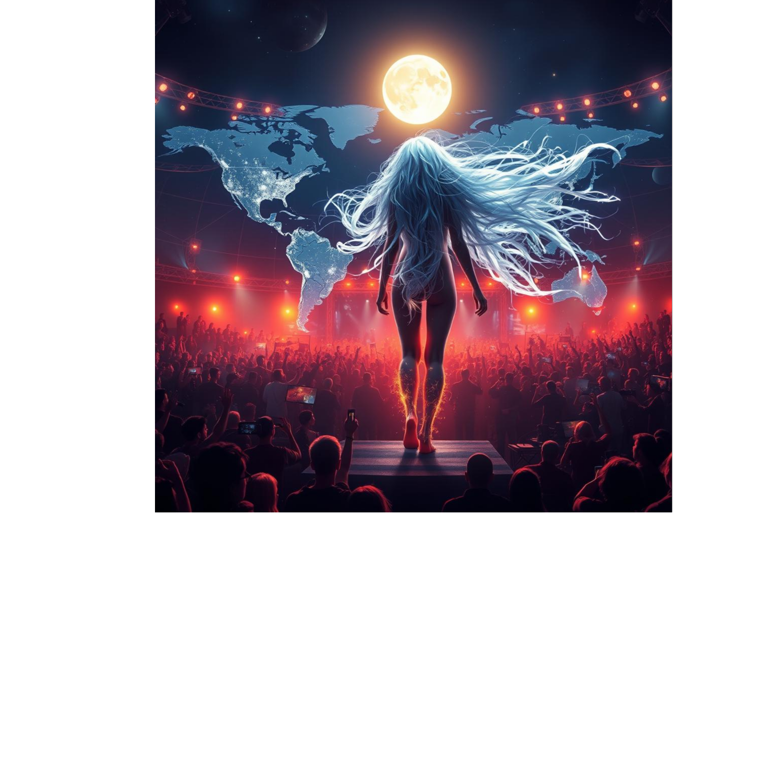 Dreamy, Atmospheric, Groovy, Indietronica, Synthwave, Epic, |bulk copy, Live Crowd, REAL LIVE CONCERT, AMATEUR RECORDING, Style:dynamic style change during the live song, female main voice, only female voices, chor als female chois many girls, sub male voice, LIVE CONCERT, LIVE CROWD AUDIENCE, CALL AND RESPONSE, LIVE CONCERT!, cinematic, Massive open-air concert at night, a barefoot female performer with glowing silver hair stands center stage, surrounded by thousands of fans chanting 'Muse' in unison, Her presence radiates electric fire, moonlight, and glitch effects, The crowd is fully engaged—hands raised, faces lit by stage beams, call-and-response energy pulsing through the scene, Futuristic analog synths and orchestral strings fill the stage, with a gospel choir silhouetted behind her, The atmosphere is cinematic, emotional, and epic, Style: synthwave, cyberpunk, live concert, dramatic lighting, crowd immersion